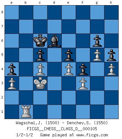 Last move : 1/2-1/2 2009 July 19 19:52:10 [Event "FICGS__CHESS__CLASS_D__000105"] [Site "FICGS"] [Date "2008.10.01"] [Round "1"] [White "Wagschal,Jean-Philippe"] [Black "Denchev,Stanimir"] [Result "1/2-1/2"] [WhiteElo "1500"] [BlackElo "1550"] 1.e4 c5 2.Nf3 Nf6 3.Nc3 d5 4.exd5 Nxd5 5.Nxd5 Qxd5 6.d3 e5 7.Be2 Nc6 8.O-O Be7 9.c4 Qd6 10.b3 O-O 11.Nd2 Bf5 12.Ne4 Qd7 13.Be3 Nd4 14.Bxd4 Qxd4 15.Qc2 Rad8 16.Rad1 Bg6 17.Nc3 a6 18.Nd5 Bg5 19.Bf3 f5 20.Nc7 Rd7 21.Ne6 Qh4 22.Nxf8 Kxf8 23.Rfe1 Qd4 24.Qe2 Bf6 25.Bh5 Bxh5 26.Qxh5 g6 27.Qh6+ Kg8 28.Qe3 Qd6 29.Qf3 Kg7 30.g3 a5 31.h4 h5 32.Kg2 Kf7 33.Qe3 Kg7 34.a3 Qd4 35.Qxd4 Rxd4 36.f3 Kf7 37.Kh3 Bg7 38.Rg1 Ke6 39.g4 Bf6 40.g5 Be7 41.Kg3 f4+ 42.Kf2 Bd6 43.Ke2 Kd7 44.Kd2 Kc6 45.Kc3 b6 46.Rge1 Bc7 47.Re4 Rxe4 48.dxe4 Bd6 49.b4 a4 50.bxc5 bxc5 51.Rb1 Bc7 52.Rd1 Bd6 53.Rb1 1/2-1/2 Sicilian : Nimzovich-Rubinstein variation Kingside Castling by player White (move 8) Kingside Castling by player Black (move 10) This chess game ended in a draw. Follow this game move after move (download)The defensive power of a pinned piece is only imaginary. (Aaron Nimzovich) Ich bin Weltmeister und muß mit niemandem irgend etwas diskutieren. (Viswanathan Anand) Las ideas audaces son como las piezas del Ajedrez que avanzan hacia adelante. Ellas pueden ser vencidas, pero también pueden iniciar una partida victoriosa. (Goethe) Ce n'est pas pour s'amuser qu'il joue aux échecs : il célèbre un culte. (Vladimir Nabokov) Every now and then a man's mind is stretched by a new idea and never shrinks back to its former dimensions. (Oliver Wendell Holmes, Sr.)