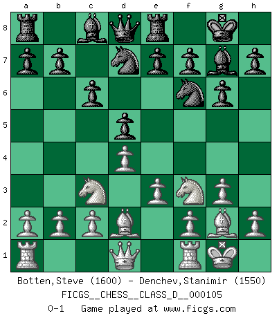 Last move : 0-1 2008 October 16 4:11:2 [Event "FICGS__CHESS__CLASS_D__000105"] [Site "FICGS"] [Date "2008.10.01"] [Round "1"] [White "Botten,Steve"] [Black "Denchev,Stanimir"] [Result "0-1"] [WhiteElo "1600"] [BlackElo "1550"] 1.Nf3 d5 2.g3 Nf6 3.Bg2 c6 4.O-O g6 5.d4 Bg7 6.Nc3 Nbd7 7.Bd2 O-O 8.e3 Re8 0-1 Reti : King's Indian attack (Barcza system) Kingside Castling by player White (move 4) Kingside Castling by player Black (move 7) Player Black won this chess game. Follow this game move after move (download)What is the difference between chess and football? Everybody understands football, but nobody plays it. Everybody plays chess, but nobody understands it. Everything is relative. (Vladimir Kramnik) Man wirke der falschen Auffassung entgegen, als ob jeder Zug Unmittelbares zu leisten habe; auch Werte- und Ruhezüge haben ihre Existenzberechtigung. (Aaron Nimzowitsch) El Ajedrez es sobre todo, ¡una pelea!. (Emanuel Lasker) Roi des jeux et jeu des rois, les échecs portent en eux un sentiment d'infini. Ils donnent à celui qui s'est efforcé d'en approfondir les arcanes l'impression de n'être pas à la mesure de l'homme; en fait, ils constituent un résumé de l'univers, un microcosme, et figurent cette grande échelle qui, dans les plans de la lumière descend jusqu'à la matière, qui des abîmes insondables remonte jusqu'en l'infini de Dieu. (Pyrame) Even the best needles are not sharp at both ends. (Chinese proverb)