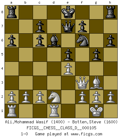 Last move : 1-0 2008 October 17 0:54:18 [Event "FICGS__CHESS__CLASS_D__000105"] [Site "FICGS"] [Date "2008.10.01"] [Round "1"] [White "Ali,Mohammad Wasif"] [Black "Botten,Steve"] [Result "1-0"] [WhiteElo "1400"] [BlackElo "1600"] 1.e4 e5 2.Nf3 Nc6 3.Bb5 a6 4.Ba4 Nf6 5.O-O d6 6.Bxc6+ bxc6 7.d4 Bg4 8.dxe5 Bxf3 9.Qxf3 dxe5 10.Rd1 Bd6 11.Bg5 h6 12.Bh4 g5 13.Bg3 Qe7 14.Nd2 1-0 Ruy Lopez : Steinitz defense deferred, Lipnitsky variation Kingside Castling by player White (move 5) Player White won this chess game. Follow this game move after move (download)Suddenly it was obvious to me in my analysis I had missed what Fischer had found with the greatest of ease at the board. (Mikhail Botvinnik) Die unerbitterlichsten Regeln im Schach sind die Ausnahmen. (Savielly Grigorievitsch Tartakower) Nada excita más a Grandes Maestros aburridos que una novedad teórica. (Dominic Lawson) Les pièces de l'échiquier étaient impitoyables. Elles le retenaient, elles l'absorbaient. Il y avait de l'horreur en cela, mais aussi une harmonie unique. Car, qu'y a-t-il dans le monde, à part les échecs ? (V. Nabokov) Philosophers use a language that is already deformed as though by shoes that are too tight. (Ludwig Wittgenstein)