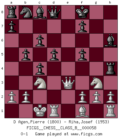 Last move : 0-1 2008 October 3 15:6:47 [Event "FICGS__CHESS__CLASS_B__000058"] [Site "FICGS"] [Date "2008.10.02"] [Round "1"] [White "D Agen,Pierre"] [Black "Riha,Josef"] [Result "0-1"] [WhiteElo "1800"] [BlackElo "1953"] 1.d4 d5 2.c4 c6 3.Nf3 Nf6 4.Nc3 e6 5.Bg5 dxc4 6.e4 b5 7.e5 h6 8.exf6 hxg5 9.Nxg5 gxf6 10.Nge4 f5 11.Ng3 Bg7 12.Qe2 Kf8 13.O-O-O Rh4 14.d5 exd5 15.Qe3 Bh6 0-1 QGD Slav : 4.Nc3 Queenside Castling by player White (move 13) Player Black won this chess game. Follow this game move after move (download)Via the squares on the chessboard, the Indians explain the movement of time and the age, the higher influences which control the world and the ties which link Chess with the human soul. (Al-Masudi) Schach ist die gewalttätigste aller Sportarten. (Garry Kasparov) La vida es como el Ajedrez, con lucha, competición y eventos buenos y malos. (Benjamin Franklin) Le profane ne songe pas à la somme de jouissance dont il se prive, qui méconnaît ce jeu aux ressources aussi variées que passionnantes. (Jean-Marie Jeanton-Lamarche) It is not true that people stop pursuing dreams because they grow old, they grow old because they stop pursuing dreams. (Gabriel Garcia Marquez)