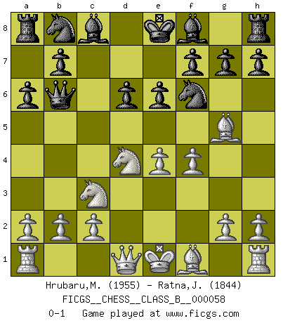 Last move : 0-1 2008 November 21 9:38:23 [Event "FICGS__CHESS__CLASS_B__000058"] [Site "FICGS"] [Date "2008.10.02"] [Round "1"] [White "Hrubaru,Mircea"] [Black "Ratna,Jean-Michel"] [Result "0-1"] [WhiteElo "1955"] [BlackElo "1844"] 1.e4 c5 2.Nf3 d6 3.d4 cxd4 4.Nxd4 Nf6 5.Nc3 a6 6.Bg5 e6 7.f4 Qb6 0-1 This chess game has been lost on time (started : 2008.10.02 9:59:0) Sicilian : Najdorf, 7...Qb6 Player Black won this chess game. Follow this game move after move (download)The battle for the ultimate truth will never be won. And that's why Chess is so fascinating. (Hans Kmoch) Ich verstehe mehr vom Schach als irgendein anderer lebender Meister. (José Raúl Capablanca) Una partida de Ajedrez se divide en 3 etapas: la primera cuando piensas que tienes la ventaja, la segunda cuando crees que tienes la ventaja y la tercera... ¡cuando te das cuenta que vas a perder!. (Savielly Tartakower) Même si l'adversaire joue le coup analysé précédemment, recommencez l'analyse en voyant la nouvelle position. Première règle de Blumenfeld Some people are so afraid to die that they never begin to live. (Henry Van Dyke)