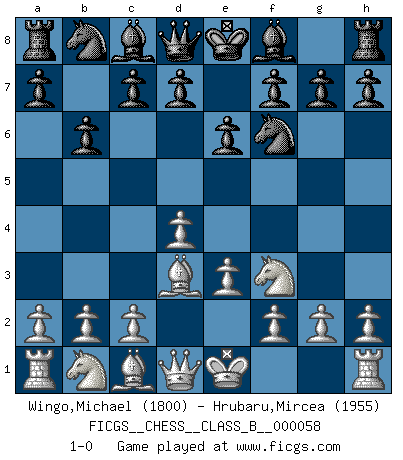 Last move : 1-0 2008 November 21 21:43:16 [Event "FICGS__CHESS__CLASS_B__000058"] [Site "FICGS"] [Date "2008.10.02"] [Round "1"] [White "Wingo,Michael"] [Black "Hrubaru,Mircea"] [Result "1-0"] [WhiteElo "1800"] [BlackElo "1955"] 1.d4 Nf6 2.Nf3 e6 3.e3 b6 4.Bd3 1-0 This chess game has been lost on time (started : 2008.10.02 9:59:0) Queen's pawn : Yusupov-Rubinstein system Player White won this chess game. Follow this game move after move (download)There are two types of sacrifices: correct ones and mine. (Mikhail Tal) Gewöhnliche Menschen denken nur daran, wie sie ihre Zeit verbringen. Ein intelligenter Mensch versucht, sie auszunutzen. (Arthur Schopenhauer) La enorme capacidad mental, en la que sin ella no puede un jugador de Ajedrez existir, es demasiado requerida por el Ajedrez al grado de que nunca podrá liberar su mente de este juego. (Albert Einstein) Je fais ceci parce que dans cinquante coups j'obtiendrai cela; je m'appelle Mikhail Moisevitch Botvinnik. (Botvinnik) Plans are ideas that never come to fruition. (Daniel Parmet)