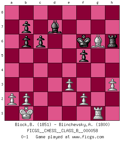 Last move : 0-1 2009 April 13 19:47:15 [Event "FICGS__CHESS__CLASS_B__000058"] [Site "FICGS"] [Date "2008.10.02"] [Round "1"] [White "Block,Benjamin"] [Black "Blinchevsky,Alexander"] [Result "0-1"] [WhiteElo "1851"] [BlackElo "1800"] 1.Nf3 d5 2.d4 e6 3.c4 Nf6 4.Nc3 c6 5.e3 Nbd7 6.Qc2 Bd6 7.g4 Nxg4 8.Rg1 f5 9.h3 Ngf6 10.Rxg7 Ne4 11.Bd2 Qf6 12.Rg2 Nf8 13.O-O-O Ng6 14.Kb1 Bd7 15.Qa4 Bc7 16.Rc1 Nxd2+ 17.Nxd2 dxc4 18.Qxc4 O-O-O 19.Nb5 Bb6 20.Nd6+ Kc7 21.Qb4 e5 22.Rxg6 hxg6 23.dxe5 Qxe5 24.Nf7 Qd5 25.Nxh8 Rxh8 26.Qc3 Re8 27.Bc4 Qc5 28.Qf6 Qd6 29.Qxd6+ Kxd6 30.Bf7 Rh8 31.Nc4+ Ke7 32.Nxb6 axb6 33.Bxg6 Kf6 34.Rg1 Rh6 0-1 Reti Opening Queenside Castling by player White (move 13) Queenside Castling by player Black (move 18) Player Black won this chess game. Follow this game move after move (download)Man is a frivolous, a specious creature, and like a Chess player, cares more for the process of attaining his goal than for the goal itself. (Dostoyevsky) Es ist wirklich schade, dass so viele Schachspieler nicht auf ihr Äußeres achten! (Alexandra Kosteniuk) El pensamiento metódico es mas útil en el Ajedrez que la inspiración. (C. J. S. Purdy) Je crois qu'il existe des manières très spécifiques de jouer efficacement contre une machine. Evidemment, nous n'avons aucune chance en technique pure, parce que l'ordinateur calcule de manière parfaite. Mais lorsque nous faisons appel à notre cerveau, en utilisant l'intuition et la compréhension, alors nous restons beaucoup plus forts. (Anatoli Karpov) Pushing plastic is for the many, pushing virtual pieces is for the fewer, pushing wood is for the very few. (Normajean Yates)