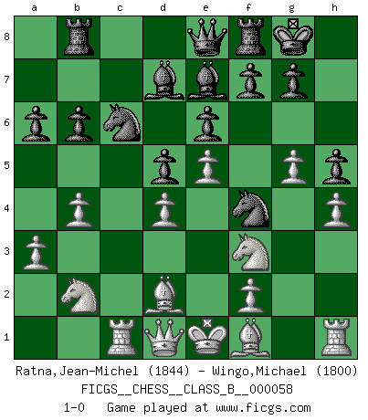 Last move : 1-0 2009 April 16 14:53:19 [Event "FICGS__CHESS__CLASS_B__000058"] [Site "FICGS"] [Date "2008.10.02"] [Round "1"] [White "Ratna,Jean-Michel"] [Black "Wingo,Michael"] [Result "1-0"] [WhiteElo "1844"] [BlackElo "1800"] 1.e4 e6 2.d4 d5 3.e5 c5 4.c3 Qb6 5.Nf3 Nc6 6.a3 Nh6 7.b4 cxd4 8.cxd4 Nf5 9.Bb2 Bd7 10.g4 Nfe7 11.Nc3 Ng6 12.h4 h5 13.Na4 Qd8 14.g5 b6 15.Rc1 Be7 16.Ba6 Rb8 17.Bd3 Nf4 18.Bf1 O-O 19.Bc3 Qe8 20.Nb2 a6 21.Bd2 1-0 This chess game has been lost on time (started : 2008.10.02 9:59:0) French : Advance variation Kingside Castling by player Black (move 18) Player White won this chess game. Follow this game move after move (download)When asked, -How is that you pick better moves than your opponents?, I responded: I'm very glad you asked me that, because, as it happens, there is a very simple answer. I think up my own moves, and I make my opponent think up his. (Alexander Alekhine) Schach ist gnadenlos. Du mußt bereit sein zu töten. (Nigel Short) Cada Peón es una Reina en potencia. (James Mason) Tout change constamment, y compris dans le monde des Echecs. (Botvinnik) The good fighters of old first put themselves beyond the possibility of defeat, and then waited for an opportunity of defeating the enemy. (Sun Tzu)