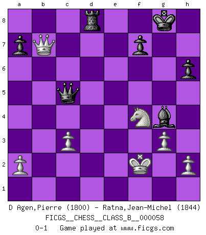 Last move : 0-1 2008 October 22 15:43:20 [Event "FICGS__CHESS__CLASS_B__000058"] [Site "FICGS"] [Date "2008.10.02"] [Round "1"] [White "D Agen,Pierre"] [Black "Ratna,Jean-Michel"] [Result "0-1"] [WhiteElo "1800"] [BlackElo "1844"] 1.d4 Nf6 2.c4 e6 3.Nc3 Bb4 4.Qc2 O-O 5.Bg5 c5 6.e3 h6 7.Bh4 cxd4 8.exd4 Nc6 9.Nf3 d5 10.cxd5 exd5 11.Be2 g5 12.O-O-O gxh4 13.Nxh4 Bxc3 14.bxc3 Ne4 15.g3 Nxf2 16.Ng6 Qg5+ 17.Nf4 Bf5 18.Qb3 Nxh1 19.Rxh1 Rae8 20.Re1 Re3 21.Kd2 Nxd4 22.Qxd5 Rxe2+ 23.Rxe2 Nxe2 24.Kxe2 Rd8 25.Qxb7 Bg4+ 26.Kf2 Qc5+ 0-1 Nimzo-Indian : Classical variation Kingside Castling by player Black (move 4) Queenside Castling by player White (move 12) Player Black won this chess game. Follow this game move after move (download)For surely of all the drugs in the world, Chess must be the most permanently pleasurable. (Assiac) Zum Sieg gelangt man nicht, wenn man gut, sondern nur wenn man besser spielt (Savielly Grigorievitsch Tartakower) Solo puedes ser bueno en el Ajedrez si amas al juego. (Bobby Fischer) On peut tirer plus d'utilité d'une partie perdue que de 100 parties gagnées. (Capablanca) If I had no sense of humor, I would long ago have committed suicide. (Mahatma Gandhi)