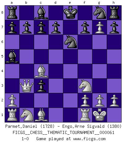 Last move : 1-0 2008 October 24 17:54:16 [Event "FICGS__CHESS__THEMATIC_TOURNAMENT__000061"] [Site "FICGS"] [Date "2008.10.03"] [Round "1"] [White "Parmet,Daniel"] [Black "Engo,Arne Sigvald"] [Result "1-0"] [WhiteElo "1728"] [BlackElo "1380"] 1.e4 e5 2.Nf3 Nc6 3.Bc4 Bc5 4.b4 Bxb4 5.c3 Ba5 6.d4 exd4 7.O-O dxc3 8.Qb3 Qf6 9.e5 Nd4 10.exf6 Ne6 11.fxg7 1-0 Evans gambit : compromised defense Kingside Castling by player White (move 7) Player White won this chess game. Follow this game move after move (download)Fischer is completely natural. He plays no roles. He's like a child. Very, very simple. (Zita Rajcsanyi) Als ich elf wurde, wurde ich einfach gut. (Robert James Fischer) Robert Fischer es la ley hacia si mismo. (Larry Evans) Toutes les manuvres exécutées sur une colonne ouverte ont pour but ultime l'intrusion définitive sur la septième ou la huitième rangée, en plein cur de la position ennemie. (Aaron Nimzovitch) How many people work in NATO Headquarters ? - About half of them. (Dirk Stikker, NATO general secretary)