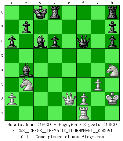 Last move : 0-1 2009 February 3 18:6:52 [Event "FICGS__CHESS__THEMATIC_TOURNAMENT__000061"] [Site "FICGS"] [Date "2008.10.03"] [Round "1"] [White "Buscia,Juan"] [Black "Engo,Arne Sigvald"] [Result "0-1"] [WhiteElo "1800"] [BlackElo "1380"] 1.e4 e5 2.Nf3 Nc6 3.Bc4 Bc5 4.b4 Bxb4 5.c3 Bc5 6.d4 exd4 7.cxd4 Bb4+ 8.Nbd2 Nf6 9.e5 Ng4 10.O-O d6 11.h3 Nh6 12.Nb3 a6 13.Bxh6 gxh6 14.e6 fxe6 15.Bxe6 Bxe6 16.d5 Bxh3 17.Kh2 Bd7 18.Qe2+ Ne5 19.g3 Qf6 20.Nh4 O-O-O 21.Rac1 c6 22.dxc6 Nxc6 23.Rxc6+ Bxc6 0-1 Evans gambit Kingside Castling by player White (move 10) Queenside Castling by player Black (move 20) Player Black won this chess game. Follow this game move after move (download)When you absolutely don't know what to do anymore, it is time to panic. (John van der Wiel) Mutter, ich bin eben Ex-Weltmeister geworden. --beim nach Hause Kommen nach dem Verlust des WM-Titels an Mihail Botvinnik -- (Mikhail Nekhemyevich Tal) Hay dos clases de hombres: aquellos que se conforman en dejarse llevar por las circunstancias y que juegan barajas y aquellos decididos a controlar las circunstancias y que juegan al Ajedrez. (Mortimer Collins) Il (Jacob Murray) ne joue pas pour le bon coup, mais pour le meilleur. (Eloi Relange) First of all, we have to go back to the classical time control. (Anatoly Karpov)