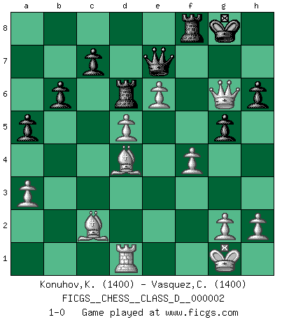 Last move : 1-0 2006 June 22 0:20:22 [Event "FICGS__CHESS__CLASS_D__000002"] [Site "FICGS"] [Date "2006.04.15"] [Round "1"] [White "Konuhov,Konstantin"] [Black "Vasquez,Carlos"] [Result "1-0"] [WhiteElo "1400"] [BlackElo "1400"] 1.d4 d5 2.c4 Nf6 3.cxd5 Qxd5 4.Nc3 Qd8 5.Nf3 e6 6.Bg5 Be7 7.e4 h6 8.Bf4 O-O 9.Qc2 Nc6 10.Rd1 Bb4 11.a3 Bxc3+ 12.bxc3 a6 13.Be2 Bd7 14.O-O Nh5 15.Be3 Nf6 16.c4 Ne7 17.Ne5 Ng6 18.Nxg6 fxg6 19.e5 Nh7 20.Qxg6 Qe8 21.Qb1 b6 22.f4 Ba4 23.Bd3 Bxd1 24.Bxh7+ Kh8 25.Rxd1 Qh5 26.Be4 Rad8 27.Bf3 Qf7 28.Bc6 Rb8 29.d5 exd5 30.cxd5 a5 31.Ba4 Rbd8 32.e6 Qe7 33.Qe4 Rd6 34.Bc2 g5 35.Bd4 Kg8 36.Qg6+ 1-0 QGD : Marshall defense Kingside Castling by player Black (move 8) Kingside Castling by player White (move 14) Player White won this chess game. Follow this game move after move (download)The way he plays Chess demonstrates a man's whole nature. (Stanley Ellin) Als ich elf wurde, wurde ich einfach gut. (Robert James Fischer) El Ajedrez lo es todo: arte, ciencia y deporte. (Anatoly Karpov) Même si vous avez un bon coup à faire, regardez toujours s'il n'y en a pas un qui lui soit préférable. (Pedro Damiano) Drag your thoughts away from your troubles... by the ears, by the heels, or any other way you can manage it. (Mark Twain)
