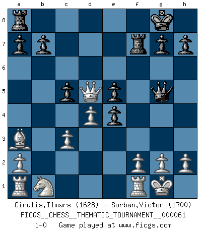 Last move : 1-0 2009 January 18 7:15:51 [Event "FICGS__CHESS__THEMATIC_TOURNAMENT__000061"] [Site "FICGS"] [Date "2008.10.03"] [Round "1"] [White "Cirulis,Ilmars"] [Black "Sorban,Victor"] [Result "1-0"] [WhiteElo "1628"] [BlackElo "1700"] 1.e4 e5 2.Nf3 Nc6 3.Bc4 Bc5 4.b4 Nxb4 5.c3 Nd3+ 6.Bxd3 Nf6 7.O-O O-O 8.Ba3 Ng4 9.Bxc5 d6 10.Ba3 c5 11.Be2 f5 12.exf5 Bxf5 13.d4 e4 14.Ne5 dxe5 15.Bxg4 Qg5 16.Bxf5 Rxf5 17.Qb3+ Rf7 18.Qd5 1-0 This chess game has been lost on time (started : 2008.10.03 13:35:59) Evans gambit declined Kingside Castling by player White (move 7) Kingside Castling by player Black (move 7) Player White won this chess game. Follow this game move after move (download)Chess is 99 percent tactics. (Teichmann) Den Ruhm habe ich schon, jetzt brauche ich noch das Geld. (Wilhelm Steinitz) El juego del Ajedrez no es solamente una diversión quieta; algunas cualidades muy valuables de la mente se pueden adquirir y cultivar con el, como convertirlos en habitos disponibles para toda ocasión; ya que la vida es algo así como el Ajedrez. (Benjamin Franklin) Les échecs sont plus proches de l'art de l'assassinat que de l'art de la guerre. (Arturo Perez-Reverte) When you've done things right people won't know you've done anything at all. (Futurama)