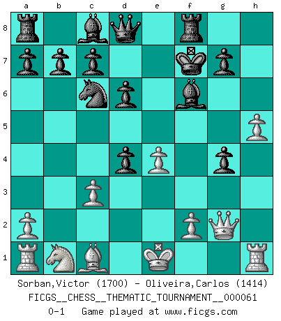 Last move : 0-1 2009 January 27 7:54:57 [Event "FICGS__CHESS__THEMATIC_TOURNAMENT__000061"] [Site "FICGS"] [Date "2008.10.03"] [Round "1"] [White "Sorban,Victor"] [Black "Oliveira,Carlos"] [Result "0-1"] [WhiteElo "1700"] [BlackElo "1414"] 1.e4 e5 2.Nf3 Nc6 3.Bc4 Bc5 4.b4 Bxb4 5.Ng5 Nh6 6.c3 Be7 7.Bxf7+ Nxf7 8.Nxf7 Kxf7 9.Qf3+ Bf6 10.h4 d6 11.g4 h6 12.h5 Rf8 13.g5 hxg5 14.d4 g4 15.Qg2 exd4 0-1 This chess game has been lost on time (started : 2008.10.03 13:35:59) Evans gambit Player Black won this chess game. Follow this game move after move (download)Chess is everything: art, science and sport. (Anatoly Karpov) Ich spiele ehrlich und spiele, um zu gewinnen. Wenn ich verliere nehme ich meine Medizin. (Robert James Fischer) Fischer deseaba darle a los Rusos una sopa de su propia medicina. (Larry Evans) Nous sommes les pions de la mystérieuse partie d'Echecs jouée par Dieu. Il nous déplace, nous arrête, nous pousse encore, puis nous lance un à un dans la boîte du Néant. Epitaphe sur la tombe de David Janowsky (1868-1927). A computer lets you make more mistakes faster than any invention in human history - with the possible exceptions of handguns and tequila. (Mitch Ratcliffe)
