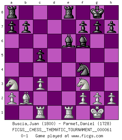 Last move : 0-1 2009 January 17 15:55:17 [Event "FICGS__CHESS__THEMATIC_TOURNAMENT__000061"] [Site "FICGS"] [Date "2008.10.03"] [Round "1"] [White "Buscia,Juan"] [Black "Parmet,Daniel"] [Result "0-1"] [WhiteElo "1800"] [BlackElo "1728"] 1.e4 e5 2.Nf3 Nc6 3.Bc4 Bc5 4.b4 Bxb4 5.c3 Be7 6.d4 Na5 7.Be2 exd4 8.Nxd4 d6 9.O-O Nf6 10.Bf3 O-O 11.Re1 Nc4 12.Nd2 Ne5 13.Be2 Re8 14.Bf3 c5 15.Nc2 d5 16.exd5 Nxf3+ 17.Nxf3 Qxd5 18.Qxd5 Nxd5 19.Bb2 Be6 20.Na3 Bf6 21.Rac1 Nf4 0-1 Evans gambit : Cordel variation Kingside Castling by player White (move 9) Kingside Castling by player Black (move 10) Player Black won this chess game. Follow this game move after move (download)Chess mastery essentially consists of analyzing Chess positions accurately. (Mikhail Botvinnik) Obwohl ich alt bin, darf mir niemand den Finger in den Mund stecken, sonst beisse ich. (Wilhelm Steinitz) Todavía soy una víctima del Ajedrez. Tiene toda la belleza del arte y mucho mas. No puede ser comercializado. El Ajedrez es mas puro que el arte en su posición social. (Marcel Duchamp) Les échecs sont utiles à l'exercice de la faculté de penser et à celle de l'imagination. Car nous devons posséder une méthode élaborée pour atteindre des buts partout où nous devons conduire notre raison. (Leibnitz) Fortune favours the audacious. (Desiderius Erasmus)