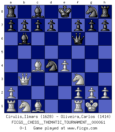 Last move : 0-1 2008 October 17 13:31:19 [Event "FICGS__CHESS__THEMATIC_TOURNAMENT__000061"] [Site "FICGS"] [Date "2008.10.03"] [Round "1"] [White "Cirulis,Ilmars"] [Black "Oliveira,Carlos"] [Result "0-1"] [WhiteElo "1628"] [BlackElo "1414"] 1.e4 e5 2.Nf3 Nc6 3.Bc4 Bc5 4.b4 Bxb4 5.c3 Ba5 6.Qb3 Qf6 7.O-O Bb6 8.d4 exd4 9.cxd4 Nxd4 0-1 Evans gambit Kingside Castling by player White (move 7) Player Black won this chess game. Follow this game move after move (download)Not all artists are Chess players, but all Chess players are artists. (Marcel Duchamp) Lisa Lane, amerikanische Schachmeisterin, hatte Fischer einmal als stärksten lebenden Spieler bezeichnet. Antwort: Das ist richtig, aber Lisa Lane ist eigentlich nicht in der Lage, das zu beurteilen. (Robert James Fischer) Ciertamente, de todas la drogas del mundo, el Ajedrez debe ser el mas placentero permamentemente. (Assiac) On est toujours la mazette de quelqu'un d'autre. (Anonyme) The only sure thing about luck is that it will change. (Wilson Mizner)