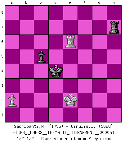 Last move : 1/2-1/2 2008 December 7 13:38:32 [Event "FICGS__CHESS__THEMATIC_TOURNAMENT__000061"] [Site "FICGS"] [Date "2008.10.03"] [Round "1"] [White "Sacripanti,Attilio"] [Black "Cirulis,Ilmars"] [Result "1/2-1/2"] [WhiteElo "1795"] [BlackElo "1628"] 1.e4 e5 2.Nf3 Nc6 3.Bc4 Bc5 4.b4 Bxb4 5.c3 Ba5 6.d4 exd4 7.O-O dxc3 8.Qb3 Qf6 9.e5 Qf5 10.Nxc3 Nge7 11.Ne2 b5 12.Bd3 Qe6 13.Qxb5 Rb8 14.Nf4 Rxb5 15.Nxe6 Rd5 16.Nf4 Rc5 17.Be3 Rc3 18.Rfd1 O-O 19.Bd2 Ra3 20.Bc1 Ra4 21.Bc2 Rb4 22.Bb3 Rd8 23.Nd5 Nxd5 24.Bxd5 Re8 25.Bd2 Rb2 26.Bxc6 Bxd2 27.Bxd7 Bxd7 28.Nxd2 Be6 29.Ne4 Rb5 30.f4 Rb4 31.Nc5 Rxf4 32.Nxe6 fxe6 33.Rac1 Re7 34.Rc5 Ra4 35.Rd2 Kf7 36.g3 g5 37.h3 Kg6 38.g4 h5 39.gxh5+ Kxh5 40.Rf2 g4 41.hxg4+ Kg5 42.Kf1 Kxg4 43.Rb5 Rf4 44.Rxf4+ Kxf4 45.Rb7 a5 46.Rb5 a4 47.Ra5 Rh7 48.Rxa4+ Kxe5 49.Ke2 c5 50.Ra6 Kd4 51.Rxe6 1/2-1/2 Evans gambit : compromised defense Kingside Castling by player White (move 7) Kingside Castling by player Black (move 18) 10 pieces endgame at move 44 : White KRRPP , Black KRPPP WHITE : King + 2 Rooks 2 Pawns BLACK : King + 1 Rook 3 Pawns 9 pieces endgame at move 44 : White KRPP , Black KRPPP WHITE : King + 1 Rook 2 Pawns BLACK : King + 1 Rook 3 Pawns 8 pieces endgame at move 48 : White KRPP , Black KRPP WHITE : King + 1 Rook 2 Pawns BLACK : King + 1 Rook 2 Pawns 7 pieces endgame at move 48 : White KRP , Black KRPP WHITE : King + 1 Rook 1 Pawn BLACK : King + 1 Rook 2 Pawns 6 pieces endgame at move 51 : White KRP , Black KRP WHITE : King + 1 Rook 1 Pawn BLACK : King + 1 Rook 1 Pawn This chess game ended in a draw. Follow this game move after move (download)The older I grow, the more I value Pawns. (Keres) Bobby Fischer ist kein Vorbild für die heutige Jugend. (Viktor Kortschnoi) El Ajedrez, como la música, como el amor, tiene el poder de hacer feliz a la gente. (Siegbert Tarrasch) Tout change constamment, y compris dans le monde des Echecs. (Botvinnik) I can't decide which is riskier; taking crazy risks, or taking advice on crazy risks from a crazy risk taker. (Gregory House in House M.D.)