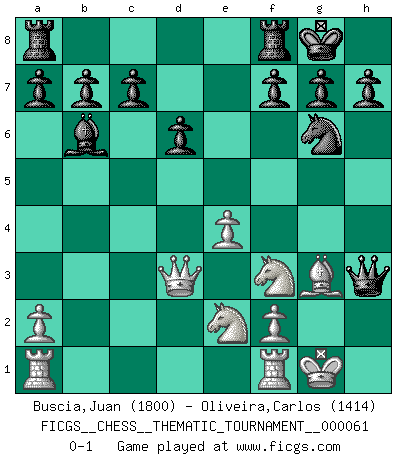 Last move : 0-1 2009 January 17 15:55:0 [Event "FICGS__CHESS__THEMATIC_TOURNAMENT__000061"] [Site "FICGS"] [Date "2008.10.03"] [Round "1"] [White "Buscia,Juan"] [Black "Oliveira,Carlos"] [Result "0-1"] [WhiteElo "1800"] [BlackElo "1414"] 1.e4 e5 2.Nf3 Nc6 3.Bc4 Bc5 4.b4 Bxb4 5.c3 Bc5 6.d4 exd4 7.O-O dxc3 8.Qb3 Qf6 9.Nxc3 Bb6 10.Bg5 Qg6 11.Bf4 Na5 12.Qb4 Nxc4 13.Qxc4 d6 14.Qd3 Ne7 15.Bg3 Be6 16.Nh4 Qh5 17.Nf3 O-O 18.h3 Bxh3 19.gxh3 Qxh3 20.Ne2 Ng6 0-1 Evans gambit Kingside Castling by player White (move 7) Kingside Castling by player Black (move 17) Player Black won this chess game. Follow this game move after move (download)I love all positions. Give me a difficult positional game, I will play it. But totally won positions, I cannot stand them. (Hein Donner) Es ist schade, dass viele Schachsportler vergessen, wie wichtig Auftreten und angemessene Kleidung sind. (Alexandra Kosteniuk) Coloca el contenido del tablero de Ajedrez en un sombrero, agita las piezas vigorosamente, derrámalas en el tablero desde una altura de medio metro y así obtienes el estilo de Wilhelm Steinitz. (H. E. Bird) D'abord les bases : Jouez et étudiez, puis étudiez et jouez, ensuite jouez et étudiez, puis étudiez et jouez. Deuxièmement : Donnez toujours le meilleur de vous-même ! (Ken Smith) If computers get too powerful, we can organize them into committees. That'll do them in. (Anonymous)