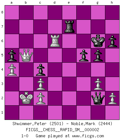 Last move : 1-0 2008 December 19 18:55:34 [Event "FICGS__CHESS__RAPID_SM__000002"] [Site "FICGS"] [Date "2008.10.04"] [Round "1"] [White "Shwimmer,Peter"] [Black "Noble,Mark"] [Result "1-0"] [WhiteElo "2501"] [BlackElo "2444"] 1.Nc3 Nf6 2.e4 e5 3.f4 d5 4.fxe5 Nxe4 5.Nf3 Be7 6.Qe2 Nxc3 7.dxc3 c5 8.Be3 O-O 9.O-O-O Nc6 10.a3 c4 11.g3 Be6 12.Bg2 Qd7 13.Rd2 a5 14.Rhd1 b5 15.Ng5 b4 16.Rxd5 Bxd5 17.Bxd5 Bxg5 18.Bxg5 bxa3 19.bxa3 Rae8 20.e6 fxe6 21.Be4 Qc8 22.Qh5 Rf5 23.Bxf5 exf5 24.Qf3 Qe6 25.Qd5 Kf7 26.Qb5 Qe4 27.Bf4 Re6 28.a4 h6 29.Kb2 g5 30.Bd6 Kg6 31.Rd5 Ne7 32.Rd4 Qg2 33.Bxe7 Rxe7 34.Rd6+ 1-0 Dunst (Sleipner, Heinrichsen) Opening Kingside Castling by player Black (move 8) Queenside Castling by player White (move 9) Player White won this chess game. Follow this game move after move (download)Is Bobby Fischer quite sane ? (Salo Flohr) Über die Verhaftung Bobby Fischers: Warum es die Bush-Administration für nötig befindet einen 61 Jahre alten Mann zu hetzten, der für niemanden ausser sich selbste eine Gefahr darstellt ist ein Rätsel. (Nigel Short) No hay precio que no valga la pena por la cabellera del Rey enemigo. (Koblentz) Même si l'adversaire joue le coup analysé précédemment, recommencez l'analyse en voyant la nouvelle position. Première règle de Blumenfeld If you are going through hell, keep going. (Winston Churchill)
