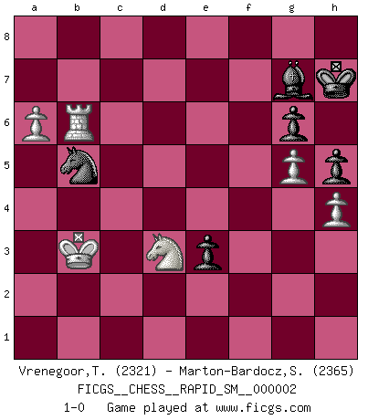 Last move : 1-0 2009 May 2 10:5:48 [Event "FICGS__CHESS__RAPID_SM__000002"] [Site "FICGS"] [Date "2008.10.04"] [Round "1"] [White "Vrenegoor,Taco"] [Black "Marton-Bardocz,Sandor"] [Result "1-0"] [WhiteElo "2321"] [BlackElo "2365"] 1.Nf3 Nf6 2.c4 g6 3.Nc3 Bg7 4.d4 O-O 5.e4 d6 6.h3 e5 7.d5 a5 8.Bg5 Qe8 9.g4 Nfd7 10.Bd3 Na6 11.a3 Ndc5 12.Bc2 Bd7 13.Qe2 a4 14.Nd2 Rb8 15.Be3 b5 16.cxb5 Bxb5 17.Nxb5 Rxb5 18.Nc4 Qd7 19.h4 Nb3 20.Bxb3 Rxb3 21.Na5 Rxe3 22.fxe3 Nc5 23.Nc6 Nxe4 24.Qg2 Nf6 25.g5 Ng4 26.e4 f5 27.Ke2 h5 28.Rae1 Kh7 29.Rhf1 Ra8 30.Kd2 Ra6 31.Kc1 Rb6 32.Rf3 f4 33.Qh3 Qc8 34.Rc3 Qb7 35.Nb4 Rb5 36.Kb1 Qb6 37.Qd3 Rc5 38.Qa6 Qb8 39.Rec1 Qf8 40.Qf1 Nh2 41.Qf2 Ng4 42.Qe2 Rxc3 43.Rxc3 Ne3 44.Qa6 Ng4 45.Qf1 Nh2 46.Qf2 Ng4 47.Qg2 Qc8 48.Qe2 Ne3 49.Nc2 Ng4 50.Ka2 Qf8 51.Ne1 Ne3 52.Rxc7 Qb8 53.Rc6 Qb3+ 54.Kb1 Nxd5 55.Qd3 Qxd3+ 56.Nxd3 Ne3 57.b4 axb3 58.a4 d5 59.a5 Nc2 60.Nf2 Na3+ 61.Kb2 Nb5 62.a6 dxe4 63.Nxe4 f3 64.Rb6 f2 65.Nxf2 e4 66.Kxb3 e3 67.Nd3 1-0 Reti Opening Kingside Castling by player Black (move 4) Player White won this chess game. Follow this game move after move (download)I like the moment when I break a man's ego. (Bobby Fischer) Jeder weiß, dass Gasprom Putins persönliches Machtinstrument ist. Die Firma wird vom Kreml aus geleitet und wird schon deshalb nie transparent sein. (Garry Kasparov) El Ajedrez, como cualquier otra actividad creativa, puede existir solo a través de méritos combinados de aquellos que tienen talento creativo y de aquellos que tienen la habilidad de organizar un trabajo creativo. (Mikhail Botvinnik) On croit qu'il y a plus de mauvais joueurs que de bons joueurs, c'est faux : Il y a autant de joueurs qui gagnent que de joueurs qui perdent. (Philippe Geluck) O divine art of subtlety and secrecy! Through you we learn to be invisible, through you inaudible and hence we can hold the enemy's fate in our hands. (Sun Tzu)