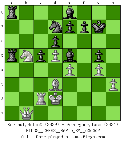 Last move : 0-1 2009 January 17 9:2:50 [Event "FICGS__CHESS__RAPID_SM__000002"] [Site "FICGS"] [Date "2008.10.04"] [Round "1"] [White "Kreindl,Helmut"] [Black "Vrenegoor,Taco"] [Result "0-1"] [WhiteElo "2329"] [BlackElo "2321"] 1.d4 Nf6 2.Bg5 Ne4 3.Bf4 c5 4.f3 Qa5+ 5.c3 Nf6 6.d5 Qb6 7.e4 Qxb2 8.Nd2 Qxc3 9.Bc7 d6 10.Ne2 Qd3 11.Rb1 b6 12.Ng3 Qe3+ 13.Be2 Nfd7 14.Qa4 g6 15.Bxb6 Bg7 16.Ba5 O-O 17.Nc4 Qd4 18.Rc1 Na6 19.Bc3 Qxc3+ 20.Rxc3 Bxc3+ 21.Kd1 Bd4 22.a3 Nb6 23.Qa5 Nc7 24.Nxb6 axb6 25.Qxb6 Ne8 26.Qb3 Bd7 27.Kd2 Nf6 28.Rb1 Ra5 29.Bd3 Rfa8 30.Ne2 Rxa3 31.Qb7 R3a7 32.Qb6 Be5 33.f4 Ba1 34.h3 h6 35.Rc1 g5 36.fxg5 hxg5 37.Nc3 Kg7 38.g4 Be8 39.Qb3 Nd7 40.Nb5 Ra2+ 41.Rc2 R2a5 42.Qb1 Be5 0-1 Trompowsky attack (Ruth, Opovcensky Opening) Kingside Castling by player Black (move 16) Player Black won this chess game. Follow this game move after move (download)A strong memory, concentration, imagination, and a strong will is required to become a great Chess player. (Bobby Fischer) Frage: Gibt es etwas was Sie mehr lieben als Autobahnen ohne Tempobegrenzungen? - Antwort: Deutsche Frauen ohne Tempobegrenzungen. (Loek van Wely) Bobby Fischer es el mas grande genio de Ajedrez de todos los tiempos. (Alexander Kotov) Les Echecs mettent en conflit, non pas deux intelligences, mais deux volontés. (Lasker) Memory is a crazy woman that hoards colored rags and throws away food. (Austin O'Malley)