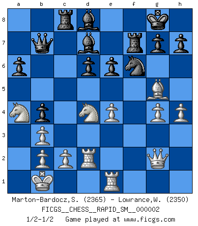 Last move : 1/2-1/2 2009 January 18 20:12:54 [Event "FICGS__CHESS__RAPID_SM__000002"] [Site "FICGS"] [Date "2008.10.04"] [Round "1"] [White "Marton-Bardocz,Sandor"] [Black "Lowrance,Wayne"] [Result "1/2-1/2"] [WhiteElo "2365"] [BlackElo "2350"] 1.e4 c5 2.Nf3 d6 3.d4 cxd4 4.Nxd4 Nf6 5.Nc3 a6 6.Bc4 e6 7.Bb3 Nbd7 8.Bg5 Nc5 9.f4 Be7 10.Qf3 Qc7 11.O-O-O b5 12.Kb1 O-O 13.f5 Nxb3 14.axb3 b4 15.Na4 Bd7 16.h4 Rac8 17.Rd2 Rfe8 18.fxe6 fxe6 19.g4 Rf8 20.Qg2 Rf7 21.Re1 Bd8 22.Rd3 Qb7 23.Rd2 1/2-1/2 Sicilian : Najdorf, Lipnitzky attack Queenside Castling by player White (move 11) Kingside Castling by player Black (move 12) This chess game ended in a draw. Follow this game move after move (download)There just isn't enough televised Chess. (David Letterman) Drei Punkte vor allen anderen ist wie einer, der im weißen Anzug posiert, während der Rest in Müllsäcke gekleidet dasteht. (Viktor Kortschnoi) Hoy en día, si tu no eres un Gran Maestro a los 14 años, es mejor que lo olvides. (Anand Viswanathan) Il n'y a pas eu de défaite parce que je ne crois pas que cet ordinateur ait jamais existé. IBM a triché en refusant d'imprimer les modes de recherche de la machine. C'est évident, pendant le match, des coups décisifs ont été joués par des êtres humains. Aujourd'hui, les meilleurs spécialistes en informatique ne peuvent toujours pas expliquer comment Deep-Blue a pu jouer contre la logique des ordinateurs. IBM a gagné une guerre de communication, mais ils sont incapables de prouver que l'ordinateur a gagné tout seul. (Garry Kasparov) Those who make the worst use of their time are the first to complain of its brevity. (Jean de la Bruyere)