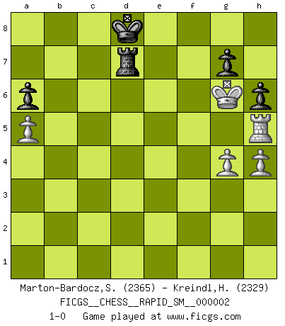 Last move : 1-0 2009 April 25 4:4:50 [Event "FICGS__CHESS__RAPID_SM__000002"] [Site "FICGS"] [Date "2008.10.04"] [Round "1"] [White "Marton-Bardocz,Sandor"] [Black "Kreindl,Helmut"] [Result "1-0"] [WhiteElo "2365"] [BlackElo "2329"] 1.e4 c6 2.d4 d5 3.exd5 cxd5 4.Bd3 Nc6 5.c3 Nf6 6.Bf4 Bg4 7.Qb3 Qc8 8.Nd2 Bh5 9.Ngf3 Bg6 10.Be2 e6 11.h3 Be7 12.O-O O-O 13.Rfe1 a6 14.a4 h6 15.a5 Bd8 16.Bd6 Re8 17.Ne5 Bf5 18.Nxc6 bxc6 19.Qa4 Qd7 20.Be5 Ne4 21.Nxe4 Bxe4 22.Rad1 Bc7 23.Bxc7 Qxc7 24.b4 f6 25.Qa2 Qf7 26.Bf1 Bf5 27.Re3 Qc7 28.Qe2 e5 29.dxe5 fxe5 30.c4 Qd6 31.cxd5 cxd5 32.g4 Bg6 33.Bg2 Bf7 34.Bxd5 Bxd5 35.Qd2 Rab8 36.Qxd5+ Qxd5 37.Rxd5 Rxb4 38.Rdxe5 Rxe5 39.Rxe5 Kf7 40.Rc5 Ra4 41.Kg2 Ke7 42.Kg3 Kd6 43.Rh5 Ke6 44.f4 Ra3+ 45.Kh4 Rf3 46.Re5+ Kf6 47.Rc5 Rxf4 48.Kh5 Rd4 49.Rf5+ Ke7 50.Kg6 Rd3 51.Re5+ Kd8 52.Rh5 Rd7 53.h4 1-0 This chess game has been lost on time (started : 2008.10.04 6:42:2) Caro-Kann : Exchange, Rubinstein variation Kingside Castling by player White (move 12) Kingside Castling by player Black (move 12) 10 pieces endgame at move 47 : White KRPPP , Black KRPPP WHITE : King + 1 Rook 3 Pawns BLACK : King + 1 Rook 3 Pawns Player White won this chess game. Follow this game move after move (download)I like the moment when I break a man's ego. (Bobby Fischer) Es gibt Leute, die glauben, alles wäre vernünftig, was man mit einem ernsthaften Gesicht tut. (Georg Christoph Lichtenberg) Coloca el contenido del tablero de Ajedrez en un sombrero, agita las piezas vigorosamente, derrámalas en el tablero desde una altura de medio metro y así obtienes el estilo de Wilhelm Steinitz. (H. E. Bird) Tous ces prétendus hommes politiques sont les pions, les Cavaliers, les Tours ou les Fous d'une partie d'échecs qui se jouera tant qu'un hasard ne renversera pas l'échiquier. (Honoré de Balzac) Luck is the residue of design. (John Milton)