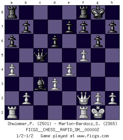 Last move : 1/2-1/2 2008 October 31 10:29:22 [Event "FICGS__CHESS__RAPID_SM__000002"] [Site "FICGS"] [Date "2008.10.04"] [Round "1"] [White "Shwimmer,Peter"] [Black "Marton-Bardocz,Sandor"] [Result "1/2-1/2"] [WhiteElo "2501"] [BlackElo "2365"] 1.Nc3 c5 2.e4 d6 3.f4 g6 4.Nf3 Bg7 5.Bc4 Nc6 6.O-O Nf6 7.d3 O-O 8.a4 a6 9.Qe1 Nd4 10.Nxd4 cxd4 11.Nd5 Nxd5 12.Bxd5 Qc7 13.Bd2 Be6 14.Ba5 Qd7 15.Bxe6 Qxe6 16.f5 Qc8 17.c4 dxc3 18.Bxc3 Qc5+ 19.Qf2 Bxc3 1/2-1/2 Dunst (Sleipner, Heinrichsen) Opening Kingside Castling by player White (move 6) Kingside Castling by player Black (move 7) This chess game ended in a draw. Follow this game move after move (download)Chess is a foolish expedient for making idle people believe they are doing something very clever when they are only wasting their time. (George Bernard Shaw) Der Freibauer hat für mich eine Seele, genau wie der Mensch, Wünsche, die unerkannt in ihm schlummern, und Befürchtungen, von deren Existenz er selbst kaum ahnt. (Aaron Nimzowitsch) Cuando estes solo, cuando te sientas un extraño en el mundo, juega al Ajedrez. Esto levantará tu espiritu y será tu consejero de guerra. (Aristóteles) Une platitude souvent récitée à propos des Echecs est qu'une des choses les plus difficiles à réaliser est de gagner une position gagnante. Cela ne manque pas de sens mais, pour ma part, j'ai toujours trouvé plus difficile de gagner une position perdante. (Tim Krabbe) Go and wake up your luck. (Persian saying)