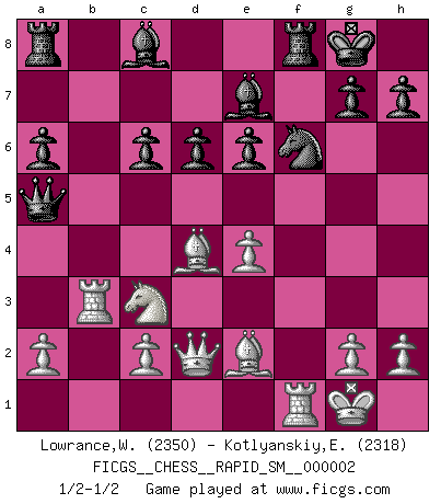 Last move : 1/2-1/2 2008 November 13 1:7:47 [Event "FICGS__CHESS__RAPID_SM__000002"] [Site "FICGS"] [Date "2008.10.04"] [Round "1"] [White "Lowrance,Wayne"] [Black "Kotlyanskiy,Edward"] [Result "1/2-1/2"] [WhiteElo "2350"] [BlackElo "2318"] 1.e4 c5 2.Nf3 d6 3.d4 cxd4 4.Nxd4 Nf6 5.Nc3 a6 6.Bg5 e6 7.f4 Qb6 8.Qd2 Qxb2 9.Rb1 Qa3 10.f5 Nc6 11.fxe6 fxe6 12.Nxc6 bxc6 13.Be2 Be7 14.O-O O-O 15.Rb3 Qc5+ 16.Be3 Qe5 17.Bd4 Qa5 1/2-1/2 Sicilian : Najdorf, 7...Qb6 Kingside Castling by player White (move 14) Kingside Castling by player Black (move 14) This chess game ended in a draw. Follow this game move after move (download)The King is a fighting piece. Use it ! (Wilhelm Steinitz) Kombinieren und Schwarzhandel gehören verboten. (Savielly Grigorievitsch Tartakower) Las piezas de Ajedrez son los bloques del alfabeto que moldean los pensamientos; y esos pensamientos, aunque hagan un diseño visual en el tablero, expresan abstractamente su belleza como un poema. (Marcel Duchamp) Tout change constamment, y compris dans le monde des Echecs. (Botvinnik) Faith : not wanting to know what is true. (Friedrich Nietzsche)