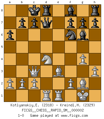 Last move : 1-0 2008 October 20 11:10:56 [Event "FICGS__CHESS__RAPID_SM__000002"] [Site "FICGS"] [Date "2008.10.04"] [Round "1"] [White "Kotlyanskiy,Edward"] [Black "Kreindl,Helmut"] [Result "1-0"] [WhiteElo "2318"] [BlackElo "2329"] 1.e4 d5 2.exd5 Qxd5 3.Nc3 Qd6 4.d4 Nf6 5.Nf3 a6 6.g3 Bg4 7.Bg2 Nc6 8.O-O O-O-O 9.d5 Nb4 10.h3 Bh5 11.Bf4 Qc5 12.Be3 Qd6 13.Qe2 e5 14.dxe6 Qxe6 15.g4 Bg6 16.Nd4 Qe8 17.Rfe1 Nbd5 18.Qc4 Qd7 19.Rad1 Nxc3 20.Qxc3 1-0 Scandinavian : Pytel-Wade variation Kingside Castling by player White (move 8) Queenside Castling by player Black (move 8) Player White won this chess game. Follow this game move after move (download)Any material change in a position must come about by mate, a capture, or a Pawn promotion. (Purdy) Die meiste Zeit treffe ich auf Gegner, die meine Enkel sein könnten. Ich bin da, um ihnen zu zeigen, dass sie von mir noch einiges lernen können. (Viktor Kortschnoi) Algunos sacrificios son sólidos, los demás son míos. (Mikhail Tal) Les échecs c'est le défi de l'alpiniste, toujours plus haut, prêt à tout pour monter à l'assaut du Roi ennemi. Les échecs, c'est de la musique en mouvement, un ballet majestueux pour les yeux. C'est de la poésie composée par les fantômes du passé qui au même titre que Rimbaud ou Verlaine méritent notre admiration. Les échecs, c'est de la peinture ou le moindre mouvement modifie le tableau pour en faire un Picasso ou un Van Gogh. Les échecs, c'est tout et rien, c'est la vie et la mort. Jjulie33 sur le forum de France-Echecs. Political correctness is subjecting us to gross incompetence. (Johann Piek)