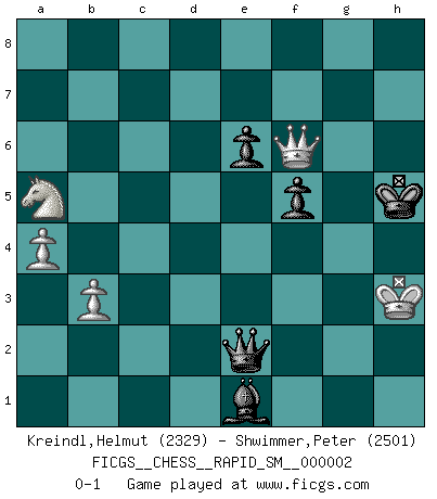 Last move : 0-1 2009 March 2 10:10:12 [Event "FICGS__CHESS__RAPID_SM__000002"] [Site "FICGS"] [Date "2008.10.04"] [Round "1"] [White "Kreindl,Helmut"] [Black "Shwimmer,Peter"] [Result "0-1"] [WhiteElo "2329"] [BlackElo "2501"] 1.d4 d5 2.c4 c6 3.e3 Bf5 4.Nc3 e6 5.Nf3 Nd7 6.Bd3 Bxd3 7.Qxd3 Ngf6 8.O-O Be7 9.e4 dxe4 10.Nxe4 O-O 11.Bf4 c5 12.Nxf6+ Bxf6 13.Rad1 cxd4 14.Bd6 Re8 15.Nxd4 Ne5 16.Bxe5 Bxe5 17.Qe4 Qc7 18.Rfe1 Bf6 19.Nb5 Qb6 20.Nd6 Re7 21.b3 Rd7 22.c5 Qxc5 23.Nxb7 Qe7 24.Rxd7 Qxd7 25.Nc5 Qd8 26.Nd7 Bc3 27.Rd1 Rc8 28.g3 h6 29.Kg2 Qc7 30.Qf3 Bb2 31.Rd2 Ba3 32.Rd4 Bd6 33.Qd3 Be7 34.Qe4 Rd8 35.Qd3 a5 36.f4 g5 37.Ne5 Rxd4 38.Qxd4 Bf6 39.Qe4 Qc3 40.Nc4 Kg7 41.Qe2 Qd4 42.h3 Qd5+ 43.Qf3 Qd7 44.a4 Qd4 45.Qe2 Qc3 46.Qd1 Be7 47.fxg5 hxg5 48.h4 gxh4 49.gxh4 Bb4 50.Qg4+ Kf8 51.Qf3 Qd4 52.Kh3 Be7 53.Qg4 Qd3+ 54.Qg3 Qf5+ 55.Qg4 Qf1+ 56.Qg2 Qd1 57.Qg3 Qh1+ 58.Qh2 Qb7 59.Qg3 f5 60.Kh2 Qe4 61.Qb8+ Kg7 62.Qg3+ Kh6 63.Nxa5 Bxh4 64.Qc3 Qe2+ 65.Kh3 Be1 66.Qf6+ Kh5 0-1 QGD Slav defense Kingside Castling by player White (move 8) Kingside Castling by player Black (move 10) 10 pieces endgame at move 63 : White KQNPP , Black KQBPP WHITE : King + 1 Queen 1 Knight 2 Pawns BLACK : King + 1 Queen 1 Bishop 2 Pawns Player Black won this chess game. Follow this game move after move (download)The mistakes are there, waiting to be made. (Savielly Tartakower) Nicht daß Diemer aus Opportunismus Mitglied der NSDAP geworden wäre. Er war ein Fanatiker, in allem, was er tat. (Hans Ree) En la vida, como en el Ajedrez, los Peones propios obstruyen nuestro camino. La gran fortuna de un hombre, su comodidad, placer, hijos, libros, que deberían ayudarle a ganar, con mucha frecuencia lo ponen en Jaque Mate. (Charles Buxton) Les échecs, c'est l'art d'analyser. (Mikhail Botvinnik) A shortcut is the longest distance between two points. (Don Groves)