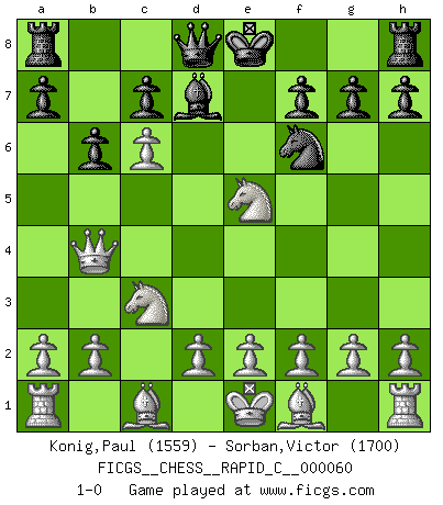 Last move : 1-0 2008 December 1 22:37:10 [Event "FICGS__CHESS__RAPID_C__000060"] [Site "FICGS"] [Date "2008.10.05"] [Round "1"] [White "Konig,Paul"] [Black "Sorban,Victor"] [Result "1-0"] [WhiteElo "1559"] [BlackElo "1700"] 1.c4 e5 2.Nc3 Nf6 3.Nf3 d5 4.cxd5 Bb4 5.Qa4+ Bd7 6.Qxb4 b6 7.Nxe5 Nc6 8.dxc6 1-0 This chess game has been lost on time (started : 2008.10.05 3:27:16) English Opening Player White won this chess game. Follow this game move after move (download)I know people who have all the will in the world, but still can't play good Chess. (Bobby Fischer) Meine Liebe ist Schach, Schach, Schach. Ich muss jeden Tag Schach spielen, deshalb fühle ich mich so stark. (Miguel Najdorf) Bendita sea la memoria de aquel que dio al mundo este juego inmortal. (A. G. Gardiner) Toutes choses étant égales, c'est la conviction qui gagne. Alliée à une volonté de vaincre, elle sert de détonateur, suscite des idées, disperse les doutes et aide à penser clairement. (Robert Fischer) Knowledge rests not upon truth alone, but upon error also. (Carl G. Jung)