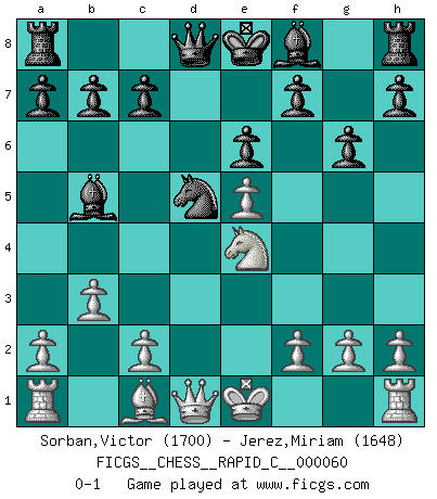 Last move : 0-1 2008 December 2 22:40:14 [Event "FICGS__CHESS__RAPID_C__000060"] [Site "FICGS"] [Date "2008.10.05"] [Round "1"] [White "Sorban,Victor"] [Black "Jerez,Miriam"] [Result "0-1"] [WhiteElo "1700"] [BlackElo "1648"] 1.Nf3 d5 2.b3 Nf6 3.d4 Nc6 4.Nc3 g6 5.e3 e6 6.Bb5 Bd7 7.e4 dxe4 8.Ne5 Nxe5 9.dxe5 Nd5 10.Nxe4 Bxb5 0-1 This chess game has been lost on time (started : 2008.10.05 3:27:16) Reti : Nimzovich-Larsen attack Player Black won this chess game. Follow this game move after move (download)Fischer is the strongest player in the world. In fact, the strongest player who ever lived. (Larry Evans) Gewöhnliche Menschen denken nur daran, wie sie ihre Zeit verbringen. Ein intelligenter Mensch versucht, sie auszunutzen. (Arthur Schopenhauer) Hoy en día, si tu no eres un Gran Maestro a los 14 años, es mejor que lo olvides. (Anand Viswanathan) Je menace de comprendre la position. (Anonyme) Better than a thousand days of diligent study is one day with a great teacher. (Japanese proverb)