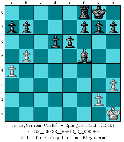 Last move : 0-1 2008 December 21 16:14:59 [Event "FICGS__CHESS__RAPID_C__000060"] [Site "FICGS"] [Date "2008.10.05"] [Round "1"] [White "Jerez,Miriam"] [Black "Spangler,Rick"] [Result "0-1"] [WhiteElo "1648"] [BlackElo "1510"] 1.e4 Nf6 2.Nc3 d5 3.Nf3 dxe4 4.Ng5 Bf5 5.Bc4 e6 6.d4 exd3 7.cxd3 Bb4 8.O-O O-O 9.a3 Bc5 10.b4 Bd4 11.Bb2 Nc6 12.b5 Ne5 13.a4 Nxd3 14.Ne2 Bxb2 15.Ra2 Be5 16.Rd2 Nd5 17.f4 N5xf4 18.Nxf4 Qxg5 19.Nxd3 Rad8 20.R1f2 Bd4 21.h3 Bxf2+ 22.Kxf2 Qh4+ 23.Kg1 Qxc4 24.Ne5 Qc5+ 25.Kh1 Rxd2 26.Qxd2 Qxe5 27.Qd7 Qd6 28.Qxd6 cxd6 0-1 Alekhine's defense : Scandinavian variation Kingside Castling by player White (move 8) Kingside Castling by player Black (move 8) Player Black won this chess game. Follow this game move after move (download)Chess is like war on a board. (Bobby Fischer) Der Verteidiger gebe der Gewalt nach, aber nur der Gewalt. Er schaffe sich nicht freiwillig, etwa aus Blindheit oder aus Schrecken, irgendwelche Schwächen. Er lasse sich nicht bluffen. (Emanuel Lasker) Solo los afeminados hacen el Enroque. (Rob Sillars) Il n'y a pas eu de défaite parce que je ne crois pas que cet ordinateur ait jamais existé. IBM a triché en refusant d'imprimer les modes de recherche de la machine. C'est évident, pendant le match, des coups décisifs ont été joués par des êtres humains. Aujourd'hui, les meilleurs spécialistes en informatique ne peuvent toujours pas expliquer comment Deep-Blue a pu jouer contre la logique des ordinateurs. IBM a gagné une guerre de communication, mais ils sont incapables de prouver que l'ordinateur a gagné tout seul. (Garry Kasparov) If you are good, you will be assigned all the work. If you are really good, you will get out of it. (Dan Rotaru)