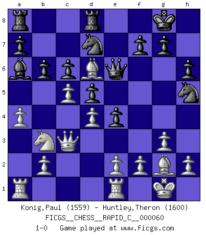 Last move : 1-0 2008 December 19 2:58:43 [Event "FICGS__CHESS__RAPID_C__000060"] [Site "FICGS"] [Date "2008.10.05"] [Round "1"] [White "Konig,Paul"] [Black "Huntley,Theron"] [Result "1-0"] [WhiteElo "1559"] [BlackElo "1600"] 1.c4 e5 2.Nc3 Bb4 3.Nd5 Be7 4.Nf3 d6 5.d4 c6 6.Nxe7 Qxe7 7.g3 e4 8.Nd2 Nf6 9.Bg2 O-O 10.O-O d5 11.Qb3 Rd8 12.c5 h6 13.Qc3 b6 14.Nb3 Ba6 15.Re1 Qe6 16.Bf4 Nbd7 17.a4 Nh5 18.Bd6 1-0 This chess game has been lost on time (started : 2008.10.05 3:27:16) English, Kramnik-Shirov counterattack Kingside Castling by player Black (move 9) Kingside Castling by player White (move 10) Player White won this chess game. Follow this game move after move (download)A Chess game is divided into three stages: the first, when you hope you have the advantage, the second when you believe you have an advantage, and the third... when you know you're going to lose ! (Savielly Tartakower) Mit Schach schule ich mein Gefühl für Geometrie, was für Tennis und Schach gleichermaßen wichtig ist. (Boris Becker) Los libros de Ajedrez deben de usarse igual como usamos los anteojos: para mejorar la vista, aunque algunos jugadores los quieren usar como si ellos les otorgaran la vision. (José Raúl Capablanca) Tous ces prétendus hommes politiques sont les pions, les Cavaliers, les Tours ou les Fous d'une partie d'échecs qui se jouera tant qu'un hasard ne renversera pas l'échiquier. (Honoré de Balzac) Always be a first-rate version of yourself, instead of a second-rate version of somebody else. (Judy Garland)