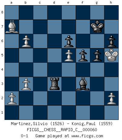 Last move : 0-1 2009 February 14 2:15:38 [Event "FICGS__CHESS__RAPID_C__000060"] [Site "FICGS"] [Date "2008.10.05"] [Round "1"] [White "Martinez,Silvio"] [Black "Konig,Paul"] [Result "0-1"] [WhiteElo "1526"] [BlackElo "1559"] 1.e4 c5 2.Nf3 Nc6 3.Bc4 e6 4.c3 d5 5.O-O dxc4 6.Na3 Nf6 7.Re1 Be7 8.Nxc4 b5 9.Ne3 Nxe4 10.b3 Qd3 11.Qe2 Qxe2 12.Rxe2 O-O 13.Ng4 f5 14.Nge5 Nxe5 15.Nxe5 Bf6 16.f4 Rd8 17.Ba3 Bb7 18.Rb1 Rxd2 19.Rxd2 Nxd2 20.Rd1 Rd8 21.Bxc5 Nf3+ 22.gxf3 Rxd1+ 23.Kf2 Rd2+ 24.Kg3 Bxe5 25.fxe5 Rd3 26.c4 Rxf3+ 27.Kh4 Rd3 28.cxb5 h6 29.Bxa7 g5+ 30.Kh5 Kg7 31.b6 Bf3+ 0-1 Comment by player 2 : Paul Konig : check mate ! Sicilian defense Kingside Castling by player White (move 5) Kingside Castling by player Black (move 12) Player Black won this chess game. Follow this game move after move (download)A thorough understanding of the typical mating continuations makes the most complicated sacrificial combinations leading up to them not only not difficult, but almost a matter of course. (Siegbert Tarrasch) Zu meiner Zeit war ein 20 jähriger ein junger Spieler, heute ist er ein Veteran. (Garry Kasparov) Si pudieramos observar el interior de la cabeza de un jugador de Ajedrez, encontraríamos ahí un mundo lleno de sentimientos, imágenes, ideas, emoción y pasión. (Alfred Binet) Celui qui prend des risques peut perdre, celui qui n'en prend pas perd toujours. (Xavier Tartacover) A good aphorism is too hard for the tooth of time, and is not worn away with the centuries, although it serves as food for every speech. (Friedrich Nietzsche)