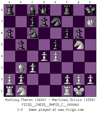 Last move : 1-0 2008 October 15 22:56:58 [Event "FICGS__CHESS__RAPID_C__000060"] [Site "FICGS"] [Date "2008.10.05"] [Round "1"] [White "Huntley,Theron"] [Black "Martinez,Silvio"] [Result "1-0"] [WhiteElo "1600"] [BlackElo "1526"] 1.e4 e5 2.Nf3 Nc6 3.Bb5 Nge7 4.c3 g6 5.O-O a6 6.Ba4 Bh6 7.d4 Bxc1 8.Qxc1 b5 9.Bb3 O-O 10.Qh6 Kh8 11.Ng5 f6 12.Qxh7+ 1-0 Ruy Lopez : Cozio defense Kingside Castling by player White (move 5) Kingside Castling by player Black (move 9) Player White won this chess game. Follow this game move after move (download)I believe that Chess possesses a magic that is also a help in advanced age. A rheumatic knee is forgotten during a game of Chess and other events can seem quite unimportant in comparison with a catastrophe on the chessboard. (Vlastimil Hort) Frage: Gibt es etwas was Sie mehr lieben als Autobahnen ohne Tempobegrenzungen? - Antwort: Deutsche Frauen ohne Tempobegrenzungen. (Loek van Wely) Personalmente, yo prefiero mirar hacia el futuro en donde un programa de computadora gane el título mundial de Ajedrez. La humanidad necesita una lección de humildad. (Richard Dawkings) C'est la seule position que je connaisse où les deux camps sont mals. Propos prêtés à V. Anand. He who laughs last probably does not get the joke. (Unknown)