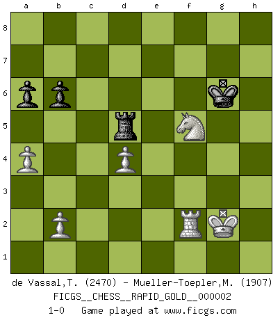 Last move : 1-0 2008 December 14 8:58:25 [Event "FICGS__CHESS__RAPID_GOLD__000002"] [Site "FICGS"] [Date "2008.10.05"] [Round "1"] [White "de Vassal,Thibault"] [Black "Mueller-Toepler,Michael"] [Result "1-0"] [WhiteElo "2470"] [BlackElo "1907"] 1.e4 c5 2.Nc3 Nc6 3.f4 g6 4.Nf3 Bg7 5.Bc4 e6 6.O-O Nge7 7.d3 d6 8.Qe1 h6 9.Bb3 a6 10.a4 Rb8 11.Be3 O-O 12.Qf2 b6 13.Qh4 Nd4 14.Bxd4 cxd4 15.Ne2 Nc6 16.Qg3 Kh8 17.h4 Rb7 18.h5 gxh5 19.Qh3 Rc7 20.Qxh5 Qf6 21.Rae1 Bd7 22.Rf2 Kg8 23.f5 exf5 24.Nf4 Nb4 25.Qh2 fxe4 26.Nh5 Qg6 27.Rxe4 Bc6 28.Rf4 Nd5 29.Bxd5 Bxd5 30.Nxg7 Qxg7 31.Nxd4 Re8 32.Nf5 Re1+ 33.Rf1 Rxf1+ 34.Kxf1 Qxg2+ 35.Qxg2+ Bxg2+ 36.Kxg2 Rxc2+ 37.Rf2 Rc5 38.Nxh6+ Kg7 39.Nf5+ Kg6 40.Nxd6 f5 41.d4 Rd5 42.Nxf5 1-0 Sicilian : Grand Prix attack Kingside Castling by player White (move 6) Kingside Castling by player Black (move 11) 10 pieces endgame at move 42 : White KRNPPP , Black KRPP WHITE : King + 1 Rook 1 Knight 3 Pawns BLACK : King + 1 Rook 2 Pawns Player White won this chess game. Follow this game move after move (download)The boy (then a 12 year old boy named Anatoly Karpov) doesn't have a clue about Chess, and there's no future at all for him in this profession. (Mikhail Botvinnik) Das Schachspiel hat wie die Liebe, die Musik, die Fähigkeit, den Menschen glücklich zu machen. Ich habe ein leises Gefühl des Bedauerns für jeden, der das Schachspiel nicht kennt, so wie ich jeden bedaure, der die Liebe nicht kennt. (Siegbert Tarrasch) Ser exitoso en el Ajedrez te permite descubrir tu propia personalidad. Eso es lo que deseo para los niños de mi clase. (Saudin Robovic) Toutes choses étant égales, c'est la conviction qui gagne. Alliée à une volonté de vaincre, elle sert de détonateur, suscite des idées, disperse les doutes et aide à penser clairement. (Robert Fischer) The Internet isn't free. It just has an economy that makes no sense to capitalism. (Brad Shapcott)