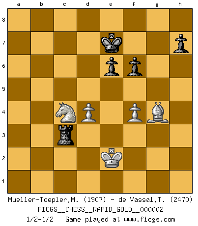 Last move : 1/2-1/2 2009 January 13 9:43:56 [Event "FICGS__CHESS__RAPID_GOLD__000002"] [Site "FICGS"] [Date "2008.10.05"] [Round "2"] [White "Mueller-Toepler,Michael"] [Black "de Vassal,Thibault"] [Result "1/2-1/2"] [WhiteElo "1907"] [BlackElo "2470"] 1.e4 c5 2.Nc3 Nc6 3.Nf3 d6 4.d4 cxd4 5.Nxd4 Nf6 6.f3 e6 7.Be3 Be7 8.Qd2 a6 9.O-O-O O-O 10.g4 Nxd4 11.Bxd4 b5 12.g5 Nd7 13.h4 b4 14.Ne2 a5 15.Be3 Ne5 16.Nd4 Bb7 17.h5 b3 18.axb3 a4 19.b4 a3 20.b3 d5 21.h6 gxh6 22.exd5 Bxd5 23.gxh6 Bf6 24.Kb1 a2+ 25.Ka1 Kh8 26.Bg2 Rg8 27.c3 Bxb3 28.Nxb3 Qxd2 29.Nxd2 Ng4 30.Bd4 Bxd4 31.cxd4 Nf2 32.Bh3 Rgb8 33.Nc4 Rxb4 34.Ne5 Ra7 35.Rhg1 Nxd1 36.Rxd1 Rab7 37.Rd2 Kg8 38.Rc2 Kf8 39.f4 Ra4 40.Rc8+ Ke7 41.Rc1 Kf6 42.Nf3 Rab4 43.Rc2 Rb1+ 44.Kxa2 R1b5 45.Rc3 Ra7+ 46.Ra3 Rxa3+ 47.Kxa3 Rh5 48.Bg4 Rxh6 49.Kb4 Rh1 50.Ne5 Rb1+ 51.Kc5 Ra1 52.Kc4 Ke7 53.Kd3 Ra3+ 54.Ke2 f6 55.Nc4 Rc3 1/2-1/2 Comment by player 2 : Thibault de Vassal : Thanks for a nice game ! Of course I missed h5 a few moves ago but it was a draw anyway. See you next time ! Sicilian : Closed, 2...Nc6 Queenside Castling by player White (move 9) Kingside Castling by player Black (move 9) 10 pieces endgame at move 48 : White KBNPP , Black KRPPP WHITE : King + 1 Bishop 1 Knight 2 Pawns BLACK : King + 1 Rook 3 Pawns This chess game ended in a draw. Follow this game move after move (download)Why must I lose to this idiot ? (Aron Nimzovich) Es gibt zwei Arten von Opfern: Korrekte und meine. (Mikhail Nekhemyevich Tal) Todos los jugadores de Ajedrez deberían tener un pasatiempo. (Savielly Tartakower) Je ne crois pas en la psychologie, je crois aux bons coups. (Robert Fischer) Before all elsed, be armed. (Niccolo Machiavelli)