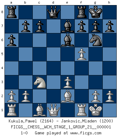 Last move : 1-0 2006 October 13 12:57:22 [Event "FICGS__CHESS__WCH_STAGE_1_GROUP_21__000001"] [Site "FICGS"] [Date "2006.08.12"] [Round "1"] [White "Kukula,Pawel"] [Black "Jankovic,Mladen"] [Result "1-0"] [WhiteElo "2164"] [BlackElo "1200"] 1.d4 d5 2.Nf3 Nf6 3.e3 Nc6 4.c4 e6 5.Nc3 Be7 6.Be2 O-O 7.O-O a6 8.Ne5 Nxe5 9.dxe5 Nd7 10.cxd5 Nxe5 11.f4 Ng6 12.dxe6 Bxe6 13.f5 1-0 Queen's pawn game Kingside Castling by player Black (move 6) Kingside Castling by player White (move 7) Player White won this chess game. Follow this game move after move (download)Whoever sees no other aim in the game than that of giving checkmate to one's opponent will never become a good Chess player. (Euwe) Ein Springer auf f6 gegen die eigene Rochadestellung ist schlimmer als ein rostiger Nagel im Knie. (Efim Bogoljubov) Fischer sacrificó virtualmente todo lo que la mayoría de nosotros los 'debiles' (término que él usa) valoramos, respetamos y apreciamos por el amor de un astuto, a menudo hermoso tablero de juego, por el privilegio ambivalente de ser su mas grande maestro. (Paul Kollar) Il s'avisa de me proposer d'apprendre les échecs qu'il jouait un peu... me voilà forcené des échecs. J'achète un échiquier, je m'enferme dans ma chambre, j'y passe des jours et des nuits à vouloir apprendre par cur toutes les parties. (Jean-Jacques Rousseau, Confessions) Coffee just isn't my cup of tea. (Unknown)