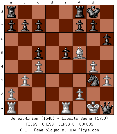 Last move : 0-1 2008 December 24 1:24:33 [Event "FICGS__CHESS__CLASS_C__000095"] [Site "FICGS"] [Date "2008.10.06"] [Round "1"] [White "Jerez,Miriam"] [Black "Lipsits,Sasha"] [Result "0-1"] [WhiteElo "1648"] [BlackElo "1759"] 1.e4 e5 2.Nf3 Nf6 3.Nc3 Nc6 4.Be2 Bb4 5.O-O Bxc3 6.dxc3 O-O 7.c4 Nxe4 8.Be3 d6 9.c5 Nxc5 10.b3 Bf5 11.c4 h6 12.h3 Qf6 13.g4 Be4 14.Bxc5 dxc5 15.Bd3 Bxf3 16.Qxf3 Qxf3 17.Bf5 Nd4 18.Rfe1 Ne2+ 19.Kf1 Ng3+ 20.Kg1 Qh1+ 0-1 Petrov Three knights game Kingside Castling by player White (move 5) Kingside Castling by player Black (move 6) Player Black won this chess game. Follow this game move after move (download)Live, lose, and learn, by observing your opponent how to win. (Amber Steenbock) Die Jungen erwarten, dass Opa einfach umfällt. Dann aber kann Opa fünf Stunden lang Schach spielen und die jungen Gegner an die Wand drücken. (Viktor Kortschnoi) En posiciones complicadas, Bobby Fischer pocas veces tuvo que temer de cualquiera. (Paul Keres) Il vaut mieux sacrifier les pièces de l'adversaire. (Xavier Tartacover) A government big enough to give you everything you want is strong enough to take everything you have. (Thomas Jefferson)