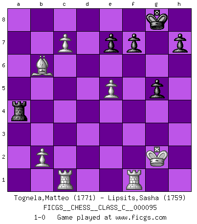 Last move : 1-0 2008 November 15 5:10:4 [Event "FICGS__CHESS__CLASS_C__000095"] [Site "FICGS"] [Date "2008.10.06"] [Round "1"] [White "Tognela,Matteo"] [Black "Lipsits,Sasha"] [Result "1-0"] [WhiteElo "1771"] [BlackElo "1759"] 1.Nf3 Nf6 2.c4 c5 3.Nc3 Nc6 4.d4 cxd4 5.Nxd4 g6 6.g3 Bg7 7.Bg2 Qb6 8.Nb3 O-O 9.c5 Qb4 10.O-O a6 11.Bd2 Qg4 12.Rc1 a5 13.a4 Qh5 14.Nb5 Nb4 15.Nc7 Rb8 16.Nxa5 Nc6 17.e4 Nxa5 18.Bxa5 Qe5 19.f4 Qh5 20.Bf3 Qh6 21.e5 Nh5 22.Nd5 Re8 23.Bc7 Ra8 24.Nb6 Ra7 25.Nxc8 Rxc8 26.Bb6 R7a8 27.Bxb7 g5 28.Qxd7 Rcb8 29.Bxa8 Rxa8 30.Qb7 Rxa4 31.c6 Nxg3 32.hxg3 Bxe5 33.fxe5 Qh3 34.c7 Qxg3+ 35.Qg2 Qxg2+ 36.Kxg2 1-0 Reti Opening Kingside Castling by player Black (move 8) Kingside Castling by player White (move 10) Player White won this chess game. Follow this game move after move (download)White lost because he failed to remember the right continuation and had to think up the moves himself. (Siegbert Tarrasch) Wenn du nicht weißt was du tun sollst, warte bis dein Gegner eine Idee hat. Sie wird sicher schlecht sein. (Siegbert Tarrasch) La mitad de las variaciones que son calculadas en una partida de torneo, resultan ser completamente superfluas. Desafortunadamente, nadie sabe por adelantado cual mitad. (Jan Tinman) Aux échecs, l'amour-propre est satisfait quand on remporte la victoire, mais il n'y a pas de honte à être battu. (Benjamin Franklin) Panic is a sudden desertion of us, an a going over to the enemy of our imagination. (Christian Nevell Bovee)