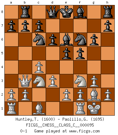 Last move : 0-1 2008 October 19 15:14:45 [Event "FICGS__CHESS__CLASS_C__000095"] [Site "FICGS"] [Date "2008.10.06"] [Round "1"] [White "Huntley,Theron"] [Black "Paolillo,Giampiero"] [Result "0-1"] [WhiteElo "1600"] [BlackElo "1695"] 1.c4 e5 2.g3 Nc6 3.Bg2 d6 4.d3 f5 5.Nc3 g6 6.Nf3 Nf6 7.O-O Be6 8.Qb3 Rb8 0-1 English Opening Kingside Castling by player White (move 7) Player Black won this chess game. Follow this game move after move (download)Some part of a mistake is always correct. (Savielly Tartakover) Schach ist ein schwarz-weisser Dschungel. (Garry Kasparov) Solo el jugador con la iniciativa tiene el derecho a atacar. (Wilhelm Steinitz) Nous vivons dans un monde échiquéen : chaque jour qui passe est un défi à relever. (Philosophe Sasha) I take risks, sometimes patients die, but not taking risks causes more patients to die. So I guess my biggest problem is I've been cursed with the ability to do the math. (Gregory House, House M.D.)