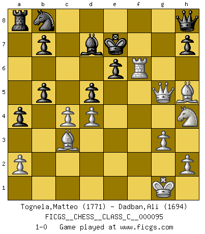 Last move : 1-0 2008 October 25 20:14:48 [Event "FICGS__CHESS__CLASS_C__000095"] [Site "FICGS"] [Date "2008.10.06"] [Round "1"] [White "Tognela,Matteo"] [Black "Dadban,Ali"] [Result "1-0"] [WhiteElo "1771"] [BlackElo "1694"] 1.Nf3 d6 2.g3 g6 3.c4 Bg7 4.d4 Nf6 5.Bg2 O-O 6.O-O c6 7.b3 a5 8.Nc3 Bf5 9.Bb2 Ne4 10.Nh4 Nxc3 11.Bxc3 Be6 12.f4 Na6 13.Qd2 Nb8 14.e4 a4 15.f5 Bd7 16.b4 e6 17.Rf2 gxf5 18.exf5 d5 19.Raf1 Bf6 20.fxe6 fxe6 21.Rxf6 Rxf6 22.Qg5+ Kf7 23.Bf3 Qh8 24.Bh5+ Ke7 25.b5 cxb5 26.Rxf6 1-0 Reti Opening Kingside Castling by player Black (move 5) Kingside Castling by player White (move 6) Player White won this chess game. Follow this game move after move (download)Some part of a mistake is always correct. (Savielly Tartakover) Schach ist Kampf, hauptsächlich jedoch gegen die eigenen Fehler. (Savielly Grigorievitsch Tartakower) Con el fin de mejorar tu juego, debes de estudiar los finales antes que todo, ya que mientras que los finales pueden ser estudiados y dominados por sí mismos, el juegomedio y la apertura deben de ser estudiados en relación con los finales. (José Raúl Capablanca) C'est la seule position que je connaisse où les deux camps sont mals. Propos prêtés à V. Anand. Do not put your faith in what statistics say until you have carefully considered what they do not say. (William W. Watt)