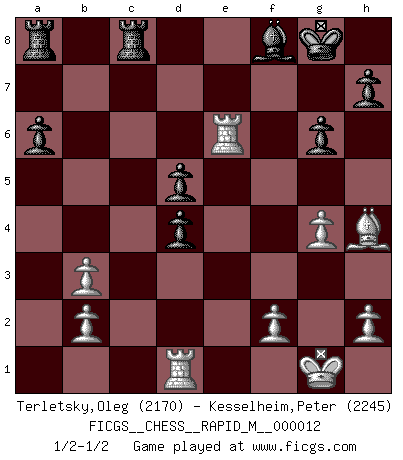 Last move : 1/2-1/2 2008 December 12 11:38:40 [Event "FICGS__CHESS__RAPID_M__000012"] [Site "FICGS"] [Date "2008.10.07"] [Round "1"] [White "Terletsky,Oleg"] [Black "Kesselheim,Peter"] [Result "1/2-1/2"] [WhiteElo "2170"] [BlackElo "2245"] 1.e4 e6 2.d4 d5 3.Nd2 c5 4.exd5 exd5 5.Ngf3 Nc6 6.Bb5 Qe7+ 7.Be2 Qc7 8.O-O Nf6 9.Re1 Be6 10.c3 cxd4 11.Nxd4 Nxd4 12.cxd4 Bd6 13.Bb5+ Nd7 14.Nf3 O-O 15.Bg5 a6 16.Rc1 Qb6 17.Ba4 Nb8 18.Qd3 Nc6 19.Bxc6 bxc6 20.Bh4 c5 21.Ng5 g6 22.Nxe6 fxe6 23.Qb3 Qxb3 24.axb3 cxd4 25.Rxe6 Rfc8 26.Rd1 Bf8 27.g4 1/2-1/2 French : Tarrasch, Open variation, Main line Kingside Castling by player White (move 8) Kingside Castling by player Black (move 14) This chess game ended in a draw. Follow this game move after move (download)We must make sure that Chess will not be like a dead language, very interesting, but for a very small group. (Sytze Faber) Früher wurde jeder komplizierte Zug, jedes interessante Opfer mit großem Beifall und Enthusiasmus aufgenommen. Heute schaltet man einfach seinen Fritz an, und man kann sehen, was los ist, ob der Zug geht oder nicht. (Vladimir Kramnik) Aunque la mayoría de la gente disfruta observar las partidas de los grandes Maestros de ataque, algunos de los jugadores mas notables en la historia han sido los jugadores silenciosos posicionales. Lentamente ellos te aplastan despojandote de tu espacio, congestionando tus piezas y dejandote virtualmente sin nada que hacer. (Yasser Seirawan) Les erreurs sont comme les malheurs, elles n'arrivent jamais seules. (Siegbert Tarrasch) When you don't know what to do, walk fast and look worried. (Anonymous)