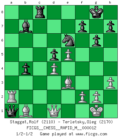 Last move : 1/2-1/2 2009 January 16 17:35:34 [Event "FICGS__CHESS__RAPID_M__000012"] [Site "FICGS"] [Date "2008.10.07"] [Round "1"] [White "Staggat,Rolf"] [Black "Terletsky,Oleg"] [Result "1/2-1/2"] [WhiteElo "2110"] [BlackElo "2170"] 1.e4 e5 2.Nf3 Nc6 3.Bb5 a6 4.Ba4 Nf6 5.O-O Be7 6.Re1 b5 7.Bb3 O-O 8.a4 Bb7 9.d3 d6 10.Bd2 Qd7 11.Nc3 Nd4 12.Nxd4 exd4 13.Ne2 c5 14.Ng3 d5 15.e5 Ne8 16.axb5 axb5 17.Rxa8 Bxa8 18.c3 dxc3 19.bxc3 Nc7 20.d4 g6 21.Bc2 Ne6 22.Nf5 Rc8 23.Nxe7+ Qxe7 24.Be3 cxd4 25.cxd4 Qb4 26.Re2 Bb7 27.h3 Qa3 28.Bb1 b4 29.Ra2 Qc3 30.Rc2 Qa1 31.Ra2 1/2-1/2 Ruy Lopez : Closed, 7...O-O Kingside Castling by player White (move 5) Kingside Castling by player Black (move 7) This chess game ended in a draw. Follow this game move after move (download)Best by test: 1. e4 (Bobby Fischer) Im Hotelzimmer gab es nur zwei Schaben. (Über die Turnierbedingungen) (Peter Swidler) La señal de un Gran Maestro es su habilidad de ganar una partida rápidamente y sin dolor. (Irving Chernev) Il a essayé de se convaincre qu'il pourrait empêcher toutes les erreurs et ne jamais perdre. L'horreur ! Gary Kasparov au sujet de Robert Fischer. Difficult things take a long time, impossible things a little longer. (Author unknown)