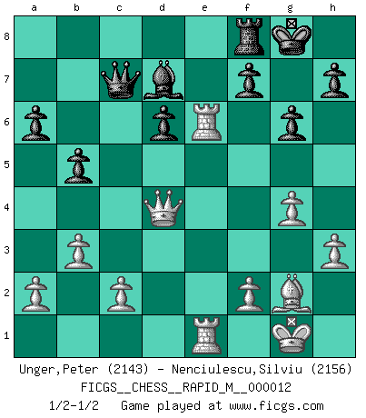 Last move : 1/2-1/2 2008 October 18 20:30:49 [Event "FICGS__CHESS__RAPID_M__000012"] [Site "FICGS"] [Date "2008.10.07"] [Round "1"] [White "Unger,Peter"] [Black "Nenciulescu,Silviu"] [Result "1/2-1/2"] [WhiteElo "2143"] [BlackElo "2156"] 1.e4 c5 2.Nf3 d6 3.d4 cxd4 4.Nxd4 Nf6 5.Nc3 a6 6.h3 g6 7.g4 Bg7 8.Bg2 O-O 9.Be3 Nc6 10.O-O Nd7 11.Qd2 Nb6 12.b3 Nxd4 13.Bxd4 Bxd4 14.Qxd4 Qc7 15.Nd5 Nxd5 16.exd5 Bd7 17.Rae1 Rae8 18.Re2 e5 19.dxe6 Rxe6 20.Rfe1 b5 21.Rxe6 1/2-1/2 Sicilian : Najdorf, Adams attack Kingside Castling by player Black (move 8) Kingside Castling by player White (move 10) This chess game ended in a draw. Follow this game move after move (download)After black's reply to 1.e4 with 1..e5, leaves him always trying to get into the game. (Howard Staunton) Der beste Spieler in einem Turnier gewinnt es nie. Er landet auf Platz zwei oder drei. (Siegbert Tarrasch) El Ajedrez, como cualquier actividad creativa, solo puede existir a través del esfuerzo combinado de aquellos que tienen talento creativo y de aquellos que poseen la habilidad de organizar su trabajo creativo. (Mikhail Botvinnik) Les échecs, c'est l'art d'analyser. (Mikhail Botvinnik) The leaves of memory seemed to make a mournful rustling in the dark. (Henry Wadsworth Longfellow)