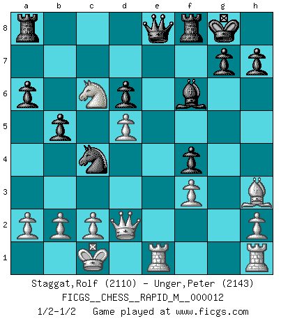 Last move : 1/2-1/2 2008 October 24 18:17:20 [Event "FICGS__CHESS__RAPID_M__000012"] [Site "FICGS"] [Date "2008.10.07"] [Round "1"] [White "Staggat,Rolf"] [Black "Unger,Peter"] [Result "1/2-1/2"] [WhiteElo "2110"] [BlackElo "2143"] 1.e4 c5 2.Nf3 d6 3.d4 cxd4 4.Nxd4 Nf6 5.Nc3 a6 6.Be3 e5 7.Nb3 Be6 8.f3 Be7 9.Qd2 O-O 10.O-O-O Nbd7 11.g4 b5 12.g5 Nh5 13.Nd5 Bxd5 14.exd5 f6 15.gxf6 Bxf6 16.Na5 Qe8 17.Bh3 Nf4 18.Bxf4 exf4 19.Nc6 Ne5 20.Rde1 Nc4 1/2-1/2 Sicilian : Najdorf, Byrne (English) attack Kingside Castling by player Black (move 9) Queenside Castling by player White (move 10) This chess game ended in a draw. Follow this game move after move (download)You must take your opponent into a deep dark forest where 2+2=5, and the path leading out is only wide enough for one. (Mikhail Tal) Schach ist das Spiel, das die Verrückten gesund hält. (Albert Einstein) De eso se trata el Ajedrez. Un día le das una lección a tu oponente y al día siguiente el te da una a tí. (Bobby Fischer) À la honte des hommes, on sait que les lois du jeu sont les seules qui soient partout justes, claires, inviolables et exécutées. Pourquoi l'Indien qui a donné les règles du jeu d'échecs est-il obéi de bon gré dans toute la terre, et que les décrétales des papes, par exemple, sont aujourd'hui un objet d'horreur et de mépris ? C'est que l'inventeur des échecs combina tout avec justesse pour la satisfaction des joueurs, et que les papes, dans leurs décrétales, n'eurent en vue que leur seul avantage. L'Indien voulut exercer également l'esprit des hommes et leur donner du plaisir; les papes ont voulu abrutir l'esprit des hommes. Voltaire (Dictionnaire philosophique / Garnier 1967) Warrior pose battles inner weakness and wins focus. You see that there is no war within you. You're on your own side, and you are your own strength. (Terri Guillemets)