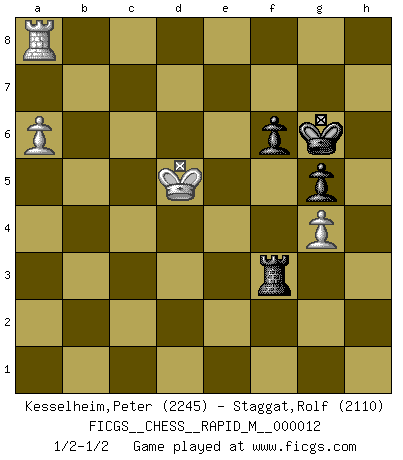 Last move : 1/2-1/2 2009 February 7 18:8:13 [Event "FICGS__CHESS__RAPID_M__000012"] [Site "FICGS"] [Date "2008.10.07"] [Round "1"] [White "Kesselheim,Peter"] [Black "Staggat,Rolf"] [Result "1/2-1/2"] [WhiteElo "2245"] [BlackElo "2110"] 1.d4 Nf6 2.c4 e6 3.Nc3 Bb4 4.e3 O-O 5.Bd3 d5 6.Nf3 c5 7.O-O dxc4 8.Bxc4 cxd4 9.exd4 b6 10.Bg5 Bb7 11.Rc1 Nbd7 12.Re1 Rc8 13.Bd3 Be7 14.Qe2 Nd5 15.Nxd5 Bxg5 16.Rxc8 Bxc8 17.Nb4 Bb7 18.Be4 Be7 19.Bxb7 Bxb4 20.Rc1 Bd6 21.g3 Bb8 22.d5 Nc5 23.dxe6 Nxe6 24.Rd1 Qf6 25.Bd5 Re8 26.Qc4 h6 27.Qc6 Rd8 28.Re1 Rd6 29.Qb7 Qd8 30.Ne5 Qc7 31.Qa8 a5 32.a4 Qa7 33.Qxa7 Bxa7 34.Nc6 Bb8 35.Bxe6 Rxc6 36.Bd7 Rd6 37.Re8+ Kh7 38.Rxb8 Rxd7 39.Rxb6 Rd4 40.b3 g5 41.Rb5 Rd3 42.Kg2 Kg6 43.g4 f6 44.h3 h5 45.Rxa5 Rxb3 46.Ra8 hxg4 47.hxg4 Rb4 48.f3 Rb2+ 49.Kf1 Rb3 50.Ke2 Rb2+ 51.Ke3 Rb3+ 52.Ke4 Rb4+ 53.Kd5 Rb3 54.a5 Rxf3 55.a6 1/2-1/2 Nimzo-Indian : 4.e3 O-O, 5.Bd3 d5 Kingside Castling by player Black (move 4) Kingside Castling by player White (move 7) 10 pieces endgame at move 46 : White KRPPP , Black KRPPP WHITE : King + 1 Rook 3 Pawns BLACK : King + 1 Rook 3 Pawns 9 pieces endgame at move 47 : White KRPPP , Black KRPP WHITE : King + 1 Rook 3 Pawns BLACK : King + 1 Rook 2 Pawns 8 pieces endgame at move 54 : White KRPP , Black KRPP WHITE : King + 1 Rook 2 Pawns BLACK : King + 1 Rook 2 Pawns This chess game ended in a draw. Follow this game move after move (download)Chess opens and enriches your mind. (Saudin Robovic) Ohne Fehler kann es keine Brillanz geben. (Emanuel Lasker) Uno por uno, yo los acribillé, mi superioridad muy pronto se volvio aparente. (Jose Capablanca) Si le désir cupide (et stupide) de gagner est une inépuisable source de souffrance, une combinaison brillante sur l'échiquier est une découverte : le coquelicot qui s'épanouit lorsque apparaît la Voie Lactée. (Arrabal) It is not true that people stop pursuing dreams because they grow old, they grow old because they stop pursuing dreams. (Gabriel Garcia Marquez)