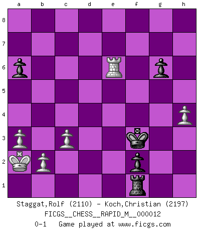 Last move : 0-1 2009 January 11 18:21:51 [Event "FICGS__CHESS__RAPID_M__000012"] [Site "FICGS"] [Date "2008.10.07"] [Round "1"] [White "Staggat,Rolf"] [Black "Koch,Christian"] [Result "0-1"] [WhiteElo "2110"] [BlackElo "2197"] 1.e4 c5 2.Nf3 d6 3.d4 cxd4 4.Nxd4 Nf6 5.Nc3 a6 6.Be3 e5 7.Nb3 Be6 8.f3 Be7 9.Qd2 O-O 10.O-O-O Nbd7 11.g4 b5 12.g5 Nh5 13.Rg1 Nb6 14.Qf2 Nc4 15.Bxc4 bxc4 16.Nc5 Qc7 17.Nxe6 fxe6 18.Qg2 g6 19.Qh3 Qd7 20.Nd5 Bd8 21.c3 Rf7 22.Nf6+ Bxf6 23.gxf6 Nxf6 24.Rg2 Rb8 25.Kb1 d5 26.Rgd2 Rb5 27.exd5 Nxd5 28.Ka1 Qe7 29.Bh6 Rf5 30.Rg1 Qc7 31.Rg3 Nf4 32.Qg4 Rb6 33.Rg1 Rd6 34.Rxd6 Qxd6 35.h4 Kf7 36.a3 Qc5 37.Bxf4 exf4 38.Qg2 Rd5 39.Re1 Re5 40.Rd1 Rd5 41.Re1 Rd3 42.Qg4 e5 43.Qg5 Qe7 44.Qh6 Qf8 45.Qxh7+ Qg7 46.Qxg7+ Kxg7 47.Rxe5 Rxf3 48.Re4 Kf6 49.Rxc4 Rf1+ 50.Ka2 f3 51.Rg4 f2 52.Rf4+ Ke5 53.Rf8 Ke4 54.Rf6 Ke3 55.Re6+ Kf3 0-1 Sicilian : Najdorf, Byrne (English) attack Kingside Castling by player Black (move 9) Queenside Castling by player White (move 10) Player Black won this chess game. Follow this game move after move (download)There are two types of sacrifices: correct ones and mine. (Mikhail Tal) Schach verlangt totale Konzentration. (Robert James Fischer) No es suficiente ser un buen jugador, se debe también de jugar bién. (Siegbert Tarrasch) Avec des compensations pour le matériel en plus... (Anonyme) A person who never made a mistake never tried anything new. (Albert Einstein)