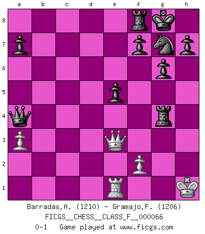 Last move : 0-1 2008 October 15 0:42:10 [Event "FICGS__CHESS__CLASS_F__000066"] [Site "FICGS"] [Date "2008.10.08"] [Round "1"] [White "Barradas,Anderson"] [Black "Gramajo,Francisco"] [Result "0-1"] [WhiteElo "1210"] [BlackElo "1206"] 1.e4 e5 2.Nf3 d6 3.d4 exd4 4.Nxd4 c5 5.Bb5+ Bd7 6.Bxd7+ Nxd7 7.O-O cxd4 8.Qxd4 Ne5 9.Nd2 Ne7 10.Qe3 b5 11.b3 g6 12.c4 bxc4 13.Nxc4 Bg7 14.Rd1 Nxc4 15.bxc4 Bxa1 16.e5 Bxe5 17.Ba3 O-O 18.Bc1 Qa5 19.a3 Nf5 20.Qh3 Rac8 21.g4 Ng7 22.Bd2 Qa4 23.Re1 Rxc4 24.Qe3 Rxg4+ 25.Kh1 Bxh2 26.Bc3 Be5 27.Bxe5 dxe5 0-1 Philidor : Exchange variation Kingside Castling by player White (move 7) Kingside Castling by player Black (move 17) Player Black won this chess game. Follow this game move after move (download)Chess is a terrific way for kids to build self image and self esteem. (Saudin Robovic) Spielt Blackmar-Diemer-Gambit, und das Matt kommt von selbst! (Emil Joseph Diemer) El Ajedrez es un juego terrible. Si no dominas el centro, tu oponente tiene una posición mas libre. Si tu tienes el centro, entonces realmente tienes algo de que preocuparte. (Siegbert Tarrasch) Les écrivains ont utilisé les échecs pour analyser les côtés extrêmes de la nature humaine. Dans ce cadre, les échecs offrent un champ d'expérimentation idéal. Mais on pourrait faire la même chose avec la peinture. Et là, en vous référant à Van Gogh, vous ne tirerez pas de conclusion définitive sur les peintres. (Gary Kasparov) It is not enough to be a good player... you must also play well. (Siegbert Tarrasch)