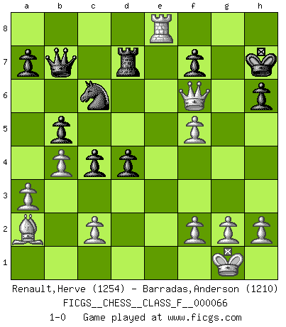 Last move : 1-0 2008 October 17 17:30:12 [Event "FICGS__CHESS__CLASS_F__000066"] [Site "FICGS"] [Date "2008.10.08"] [Round "1"] [White "Renault,Herve"] [Black "Barradas,Anderson"] [Result "1-0"] [WhiteElo "1254"] [BlackElo "1210"] 1.e4 e5 2.Nf3 Nf6 3.Nc3 d6 4.d4 exd4 5.Nxd4 Qe7 6.Bg5 h6 7.Bxf6 Qxf6 8.Nd5 Qd8 9.Bb5+ c6 10.Ba4 Qa5+ 11.Nc3 Be7 12.O-O O-O 13.a3 b5 14.b4 Qa6 15.Bb3 c5 16.Nd5 Bf6 17.Nxf6+ gxf6 18.Nf5 Bxf5 19.exf5 c4 20.Qg4+ Kh7 21.Ba2 Nc6 22.Qe4 Rac8 23.Qe3 d5 24.Rad1 Rfe8 25.Qf3 d4 26.Qd5 Rc7 27.Qd6 Qb6 28.Qxf6 Rd7 29.Rde1 Rxe1 30.Rxe1 Qb7 31.Re8 1-0 Petrov Three knights game Kingside Castling by player White (move 12) Kingside Castling by player Black (move 12) Player White won this chess game. Follow this game move after move (download)Castle early and often. (Rob Sillars) Es ist nicht das erste mal, dass sich die FIDE dem Arabischen Geld gebeugt hat (über die FIDE WM 2004 in Lybien). (Larry Evans) No es tiempo de jugar al Ajedrez cuando la casa esta en llamas. (Proverbio Italiano) Nous vivons dans un monde échiquéen : chaque jour qui passe est un défi à relever. (Philosophe Sasha) Tomorrow's what you make of it. (Horatio Caine, C.S.I. Miami)
