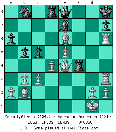 Last move : 1-0 2008 October 14 15:1:19 [Event "FICGS__CHESS__CLASS_F__000066"] [Site "FICGS"] [Date "2008.10.08"] [Round "1"] [White "Marcel,Alexis"] [Black "Barradas,Anderson"] [Result "1-0"] [WhiteElo "1047"] [BlackElo "1210"] 1.f4 e6 2.Nf3 f5 3.e3 d6 4.Be2 Nc6 5.Ng5 Be7 6.Nf3 Nf6 7.O-O O-O 8.b3 Bd7 9.Bb2 Ne4 10.d3 Nc5 11.Qe1 e5 12.fxe5 d5 13.d4 Ne4 14.c3 f4 15.exf4 Bf5 16.Nbd2 a6 17.Nxe4 Bxe4 18.Nd2 Rf5 19.Nxe4 dxe4 20.Bg4 Rf8 21.Qxe4 Qe8 22.Rae1 Rd8 23.Be6+ Kh8 24.Rf3 b5 25.Rh3 g6 26.R1e3 Nb8 27.Reg3 c5 28.Rxg6 Rxf4 29.Rgh6 1-0 Bird's Opening Kingside Castling by player White (move 7) Kingside Castling by player Black (move 7) Player White won this chess game. Follow this game move after move (download)I am the best player in the world and I am here to prove it. (Bobby Fischer) Du weisst es gibt ein Problem mit Computern und Fernschach, wenn jeder eine Rating von 2450 hat. (John Christen Knudsen) Bobby solo arroja las piezas y solas caen en las casillas correctas. (Miguel Najdorf ) Les réformistes prétendent que les progrès de la théorie conduiront à la disparition des échecs, et qu'il faut, pour leur rendre vie, en remanier les règles. En réalité, qu'exprime cette affirmation? Le mépris de l'intuition, de l'imagination et de tous les autres éléments qui font des échecs un art. (Alexander Alekhine) In my experience, there's no such thing as luck. (Obi-Wan Kenobi in Star Wars ep.4)