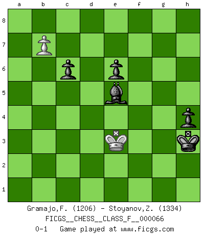 Last move : 0-1 2008 October 31 19:17:13 [Event "FICGS__CHESS__CLASS_F__000066"] [Site "FICGS"] [Date "2008.10.08"] [Round "1"] [White "Gramajo,Francisco"] [Black "Stoyanov,Zdravko"] [Result "0-1"] [WhiteElo "1206"] [BlackElo "1334"] 1.e4 c6 2.e5 d6 3.exd6 Qxd6 4.Nf3 Bg4 5.Be2 g6 6.O-O Nf6 7.d3 Nbd7 8.Bg5 h6 9.Bh4 Bxf3 10.Bxf3 Bg7 11.Bg3 Qb4 12.b3 Qd4 13.c3 Qb6 14.d4 O-O-O 15.b4 h5 16.a4 a6 17.a5 Qb5 18.Na3 Qg5 19.Qe2 e6 20.h3 h4 21.Bh2 Rde8 22.Nc4 Nh5 23.Nb6+ Nxb6 24.axb6 Nf4 25.Bxc6 bxc6 26.Qxa6+ Kd7 27.Qb7+ Kd6 28.Qc7+ Kd5 29.Ra5+ Ke4 30.f3+ Kd3 31.Rxg5 Ne2+ 32.Kf2 Nxc3 33.Qxf7 Bxd4+ 34.Ke1 Nd5 35.Qxg6+ Kc4 36.Be5 Rhg8 37.Qc2+ Nc3 38.Rxg8 Rxg8 39.b7 Bxe5 40.Kd2 Rxg2+ 41.Kc1 Rxc2+ 42.Kxc2 Kxb4 43.Rb1+ Nxb1 44.Kxb1 Kc3 45.Kc1 Kd3 46.Kd1 Ke3 47.Ke1 Kxf3 48.Kd2 Kg3 49.Ke3 Kxh3 0-1 Caro-Kann defense Kingside Castling by player White (move 6) Queenside Castling by player Black (move 14) 10 pieces endgame at move 43 : White KPPP , Black KBNPPP WHITE : King + 3 Pawns BLACK : King + 1 Bishop 1 Knight 3 Pawns 9 pieces endgame at move 44 : White KPPP , Black KBPPP WHITE : King + 3 Pawns BLACK : King + 1 Bishop 3 Pawns 8 pieces endgame at move 47 : White KPP , Black KBPPP WHITE : King + 2 Pawns BLACK : King + 1 Bishop 3 Pawns 7 pieces endgame at move 49 : White KP , Black KBPPP WHITE : King + 1 Pawn BLACK : King + 1 Bishop 3 Pawns Player Black won this chess game. Follow this game move after move (download)Personally, I rather look forward to a computer program winning the world Chess Championship. Humanity needs a lesson in humility. (Richard Dawkings) Im Internet Chess Club betrug mein Rating vorübergehend 3350 ELO-Punkte. (Sergej Karjakin) El Ajedrez expande y enriquece tu mente. (Saudin Robovic) Lorsque vous vous retrouvez devant une position atroce, ne tendez pas un ultime piège dérisoire avec l'intention d'abandonner si l'adversaire le déjoue ! Faites-vous plutôt un devoir de résister comme si votre vie en dépendait. Jouez le coup qui vous déplairait au centuple si vous étiez dans la peau de votre tortionnaire ! I've never seen so many men wasted so badly. (Blondie in The Good, The Bad and The Ugly)